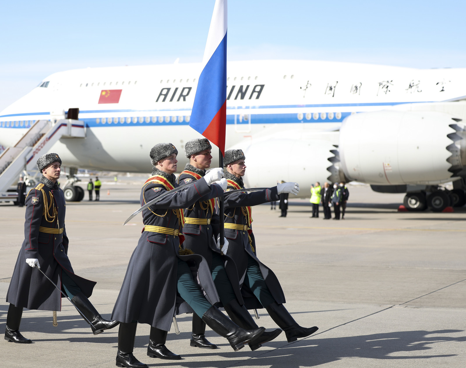 俄方在机场举行隆重迎宾仪式。军乐团奏中俄两国国歌。习近平主席检阅俄罗斯三军仪仗队并观看分列式。
