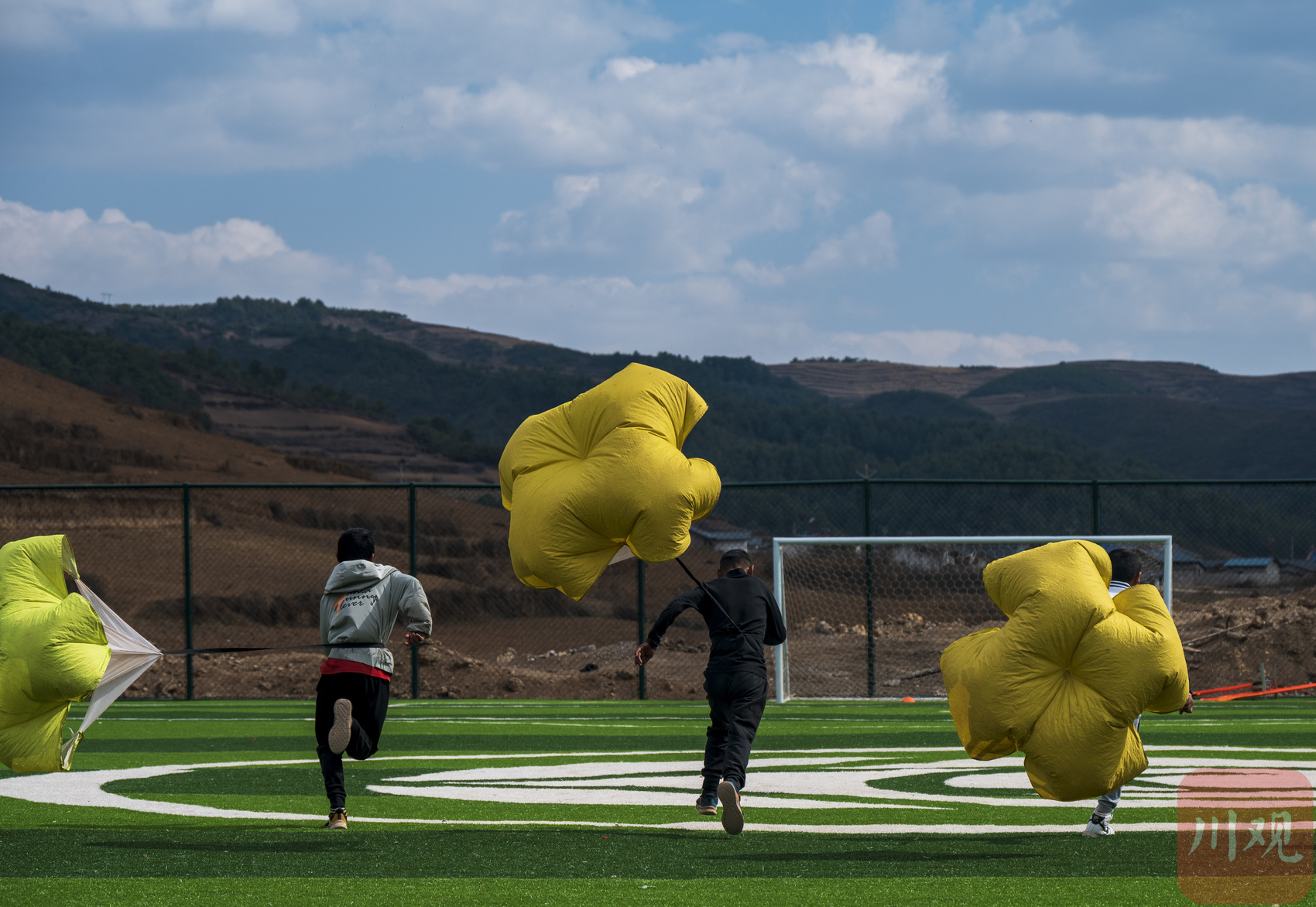 3月16日,队员们穿戴上跑步阻力伞进行体能训练。