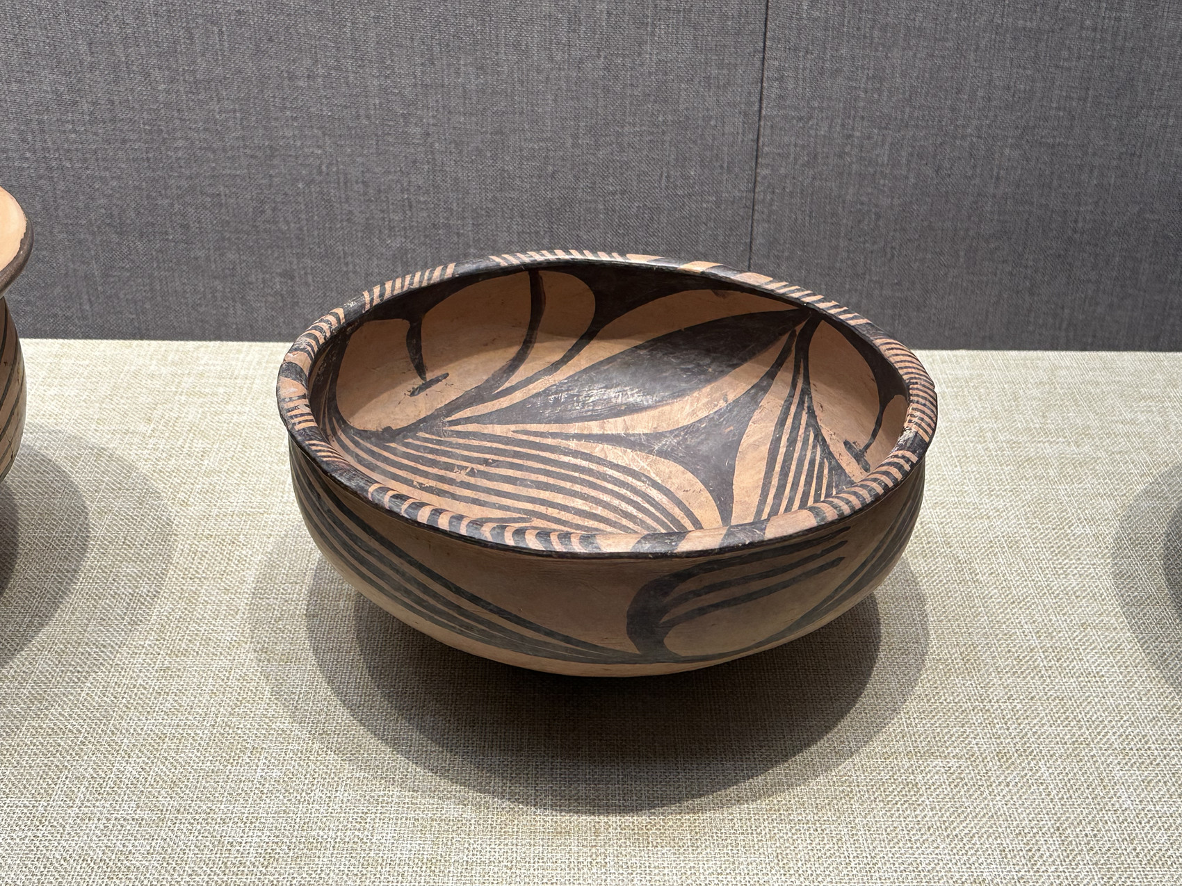 本次展览还展出了大量饰以旋涡纹、弧线纹、水波纹、平行条纹等纹饰的彩陶,这些纹饰线条清晰、流畅典雅,具有极高的学术研究价值。据介绍,旋涡水波纹是马家窑文化类型对自然界江河湖泊的生动描绘。连续的旋涡翻腾不息,一道道水波顺势而下,体现了马家窑上古先民对大自然的崇拜,对生命之源的敬畏;蛙纹反映出原始先民企盼氏族部落能繁衍生息,迅速壮大的美好愿望;四大圆圈纹则是在继承半山锯齿旋涡纹基础上演化而成,外圆寓天,内方代表土地,流露出古人类朴素的“天圆地方”的思想。