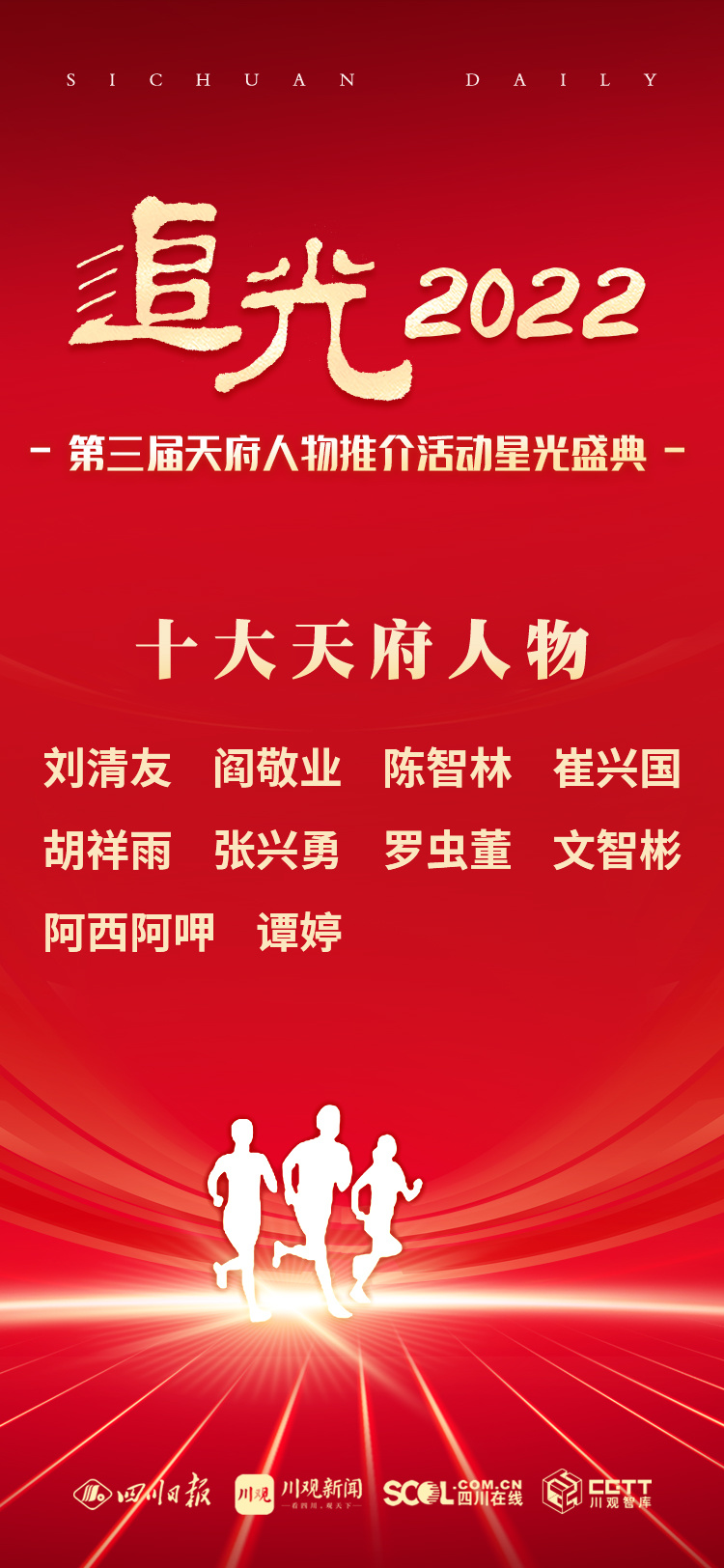 3月23日上午,在射洪举行的追光2022·第三届天府人物推介活动星光盛典上,刘清友、阎敬业、陈智林、崔兴国、胡祥雨、张兴勇、罗虫董、文智彬、阿西阿呷、谭婷等十人,获评“十大天府人物”。在此前召开的评审会上,评审委员会结合候选人事迹、专家意见、网络点赞情况等,最终确定了这一名单。