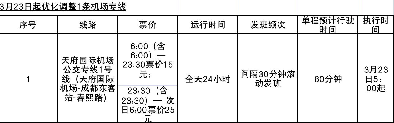 3月22日,川观新闻记者从成都公交集团获悉,为服务“两场一体”运行,为旅客提供便利的出行服务,成都公交在市交通运输局指导下,研究制定了天府国际机场公交专线优化提升方案,提升后的专线共计5条,全部为24小时全天候专线,将于3月23日开始陆续开行。