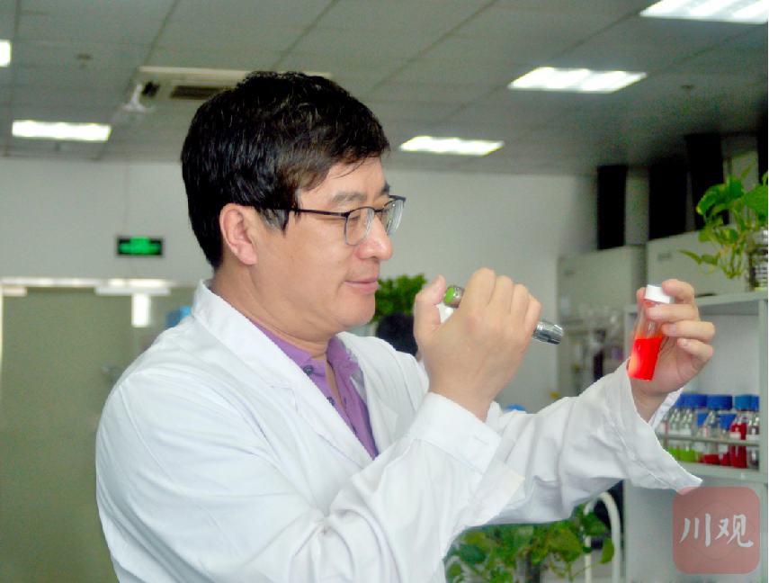 星烁公司董事长王允军向记者展示具有更高发光效率的量子点材料。