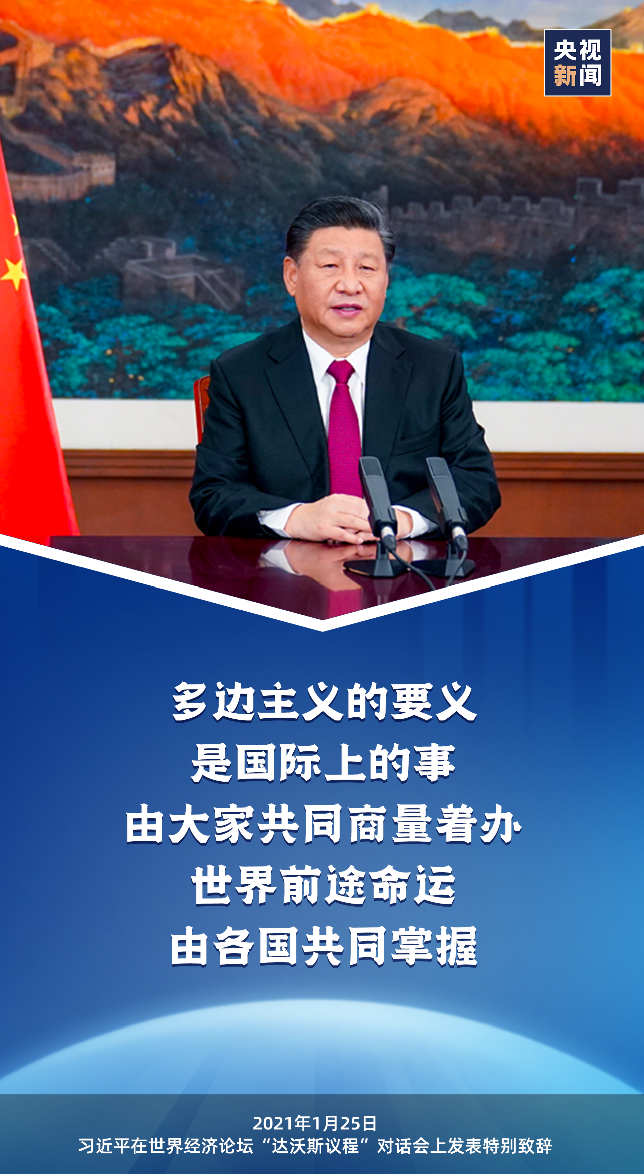 在2021年1月召开的世界经济论坛“达沃斯议程”对话会上,习近平主席发表特别致辞,再次强调践行多边主义,并指出“多边主义的要义是国际上的事由大家共同商量着办”。
