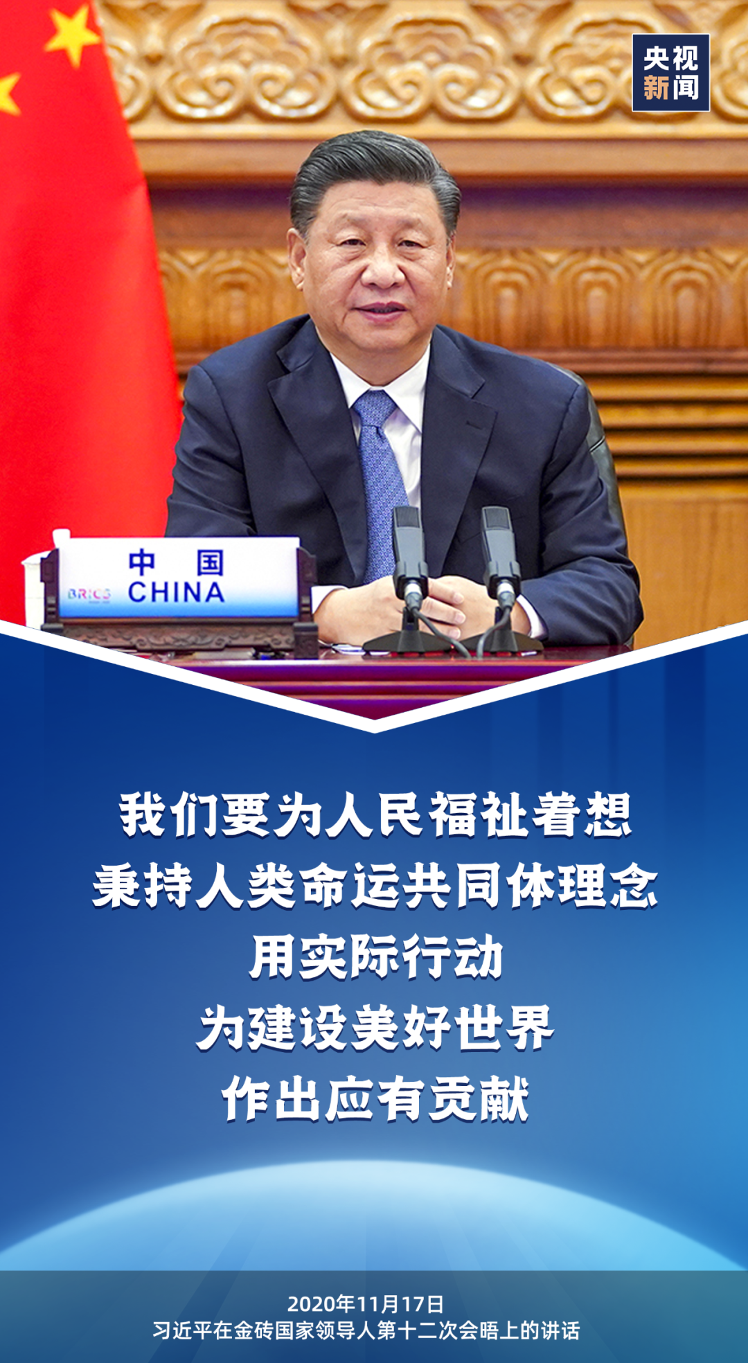 2020年11月17日,国家主席习近平出席金砖国家领导人第十二次会晤并发表重要讲话时指出,“我们要为人民福祉着想,秉持人类命运共同体理念,用实际行动为建设美好世界作出应有贡献。”