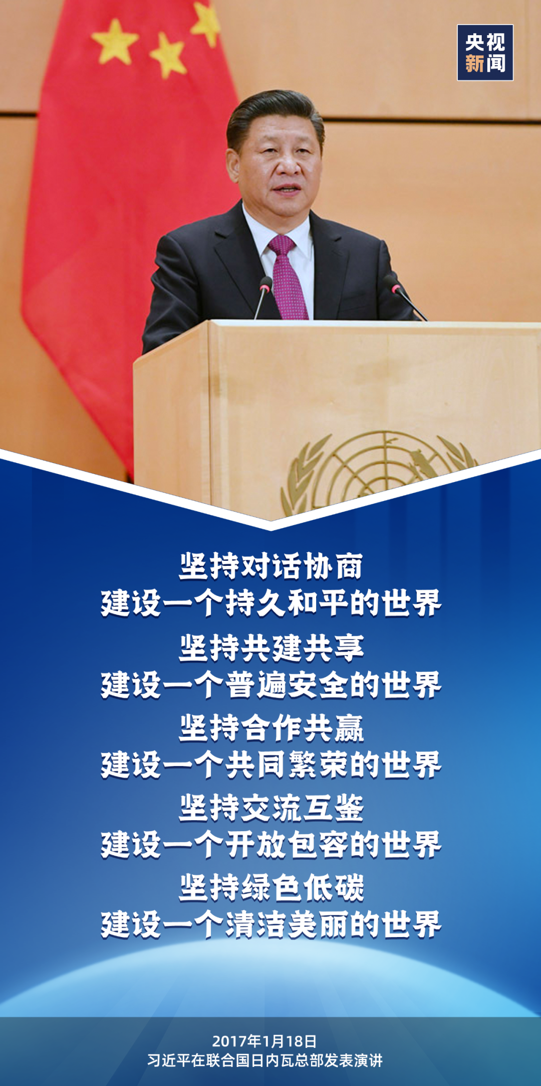 从2013年在莫斯科国际关系学院,到2017年在日内瓦万国宫,再到2021年在世界经济论坛“达沃斯议程”对话会……习近平主席在一系列重大国际场合深入阐释构建人类命运共同体理念,提出中国主张——“建设持久和平、普遍安全、共同繁荣、开放包容、清洁美丽的世界”。