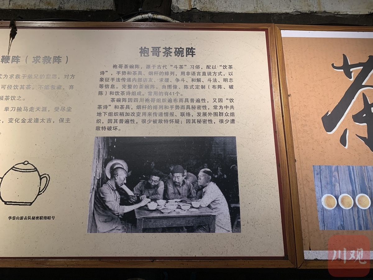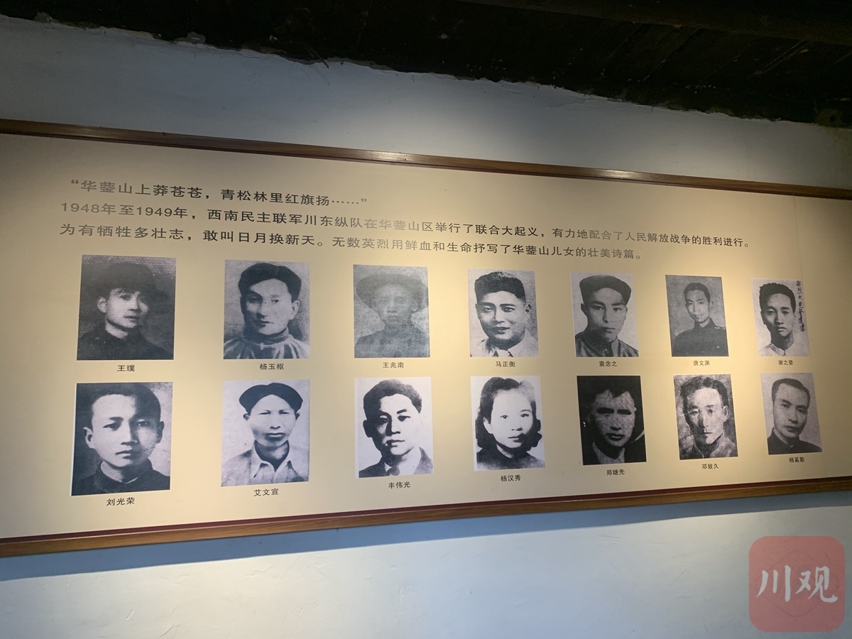 室内,墙面上悬挂着绘着华蓥山游击队起义的画面,还有一位位革命先烈的画像。你甚至可以走进小说《红岩》中“双枪老太婆”原型之一的刘隆华曾居住过的地方,重温那段艰难岁月;也可以照着画面中的联络方式,按照“袍哥”的方式,练习一下各种接头暗号。