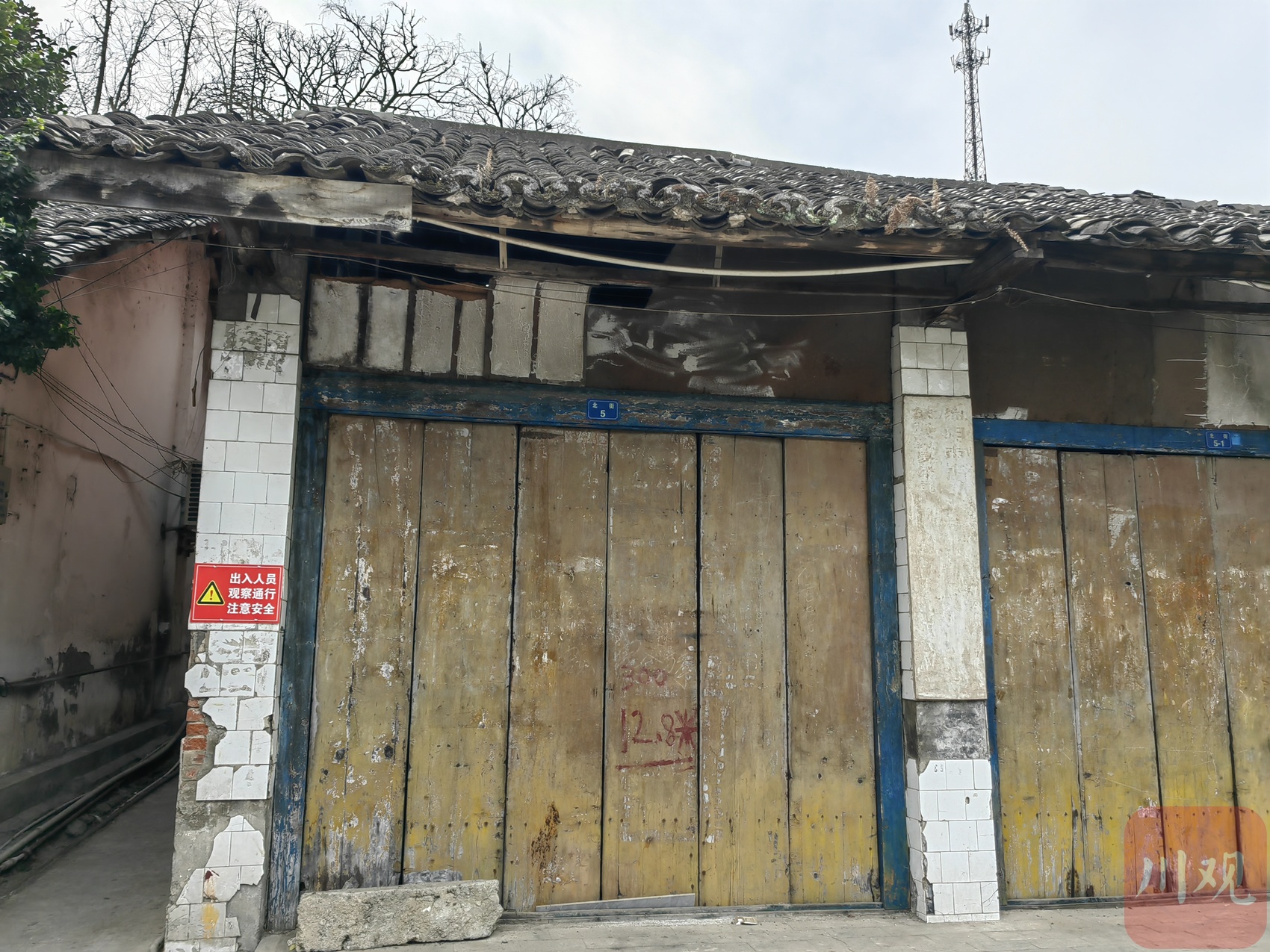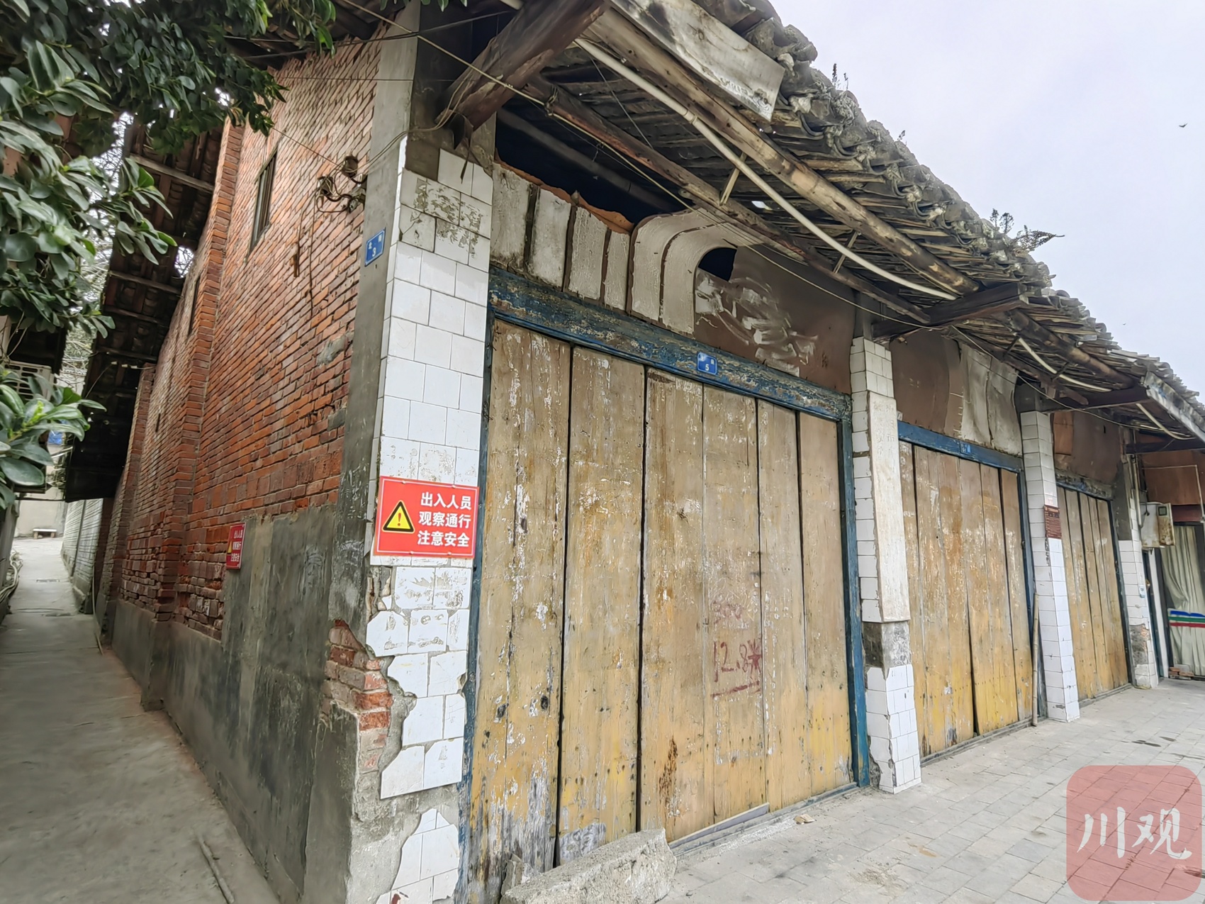 位于绵阳市涪城区丰谷镇二社区北大街5号的经营性自建房,三间铺面的木门紧锁。从门缝看进去,阳光从屋顶多处较大面积的破洞中洒下来。斑驳的外墙上,挂着红色警示牌“出入人员观察通行注意安全”。