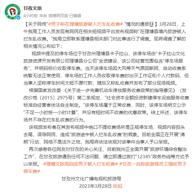 3月28日,上午我局工作人员发现有网民在相关短视频平台发布视频称“在理塘县境内旅游被人拦车乱收费。”我局立即联系理塘县相关部门对此事进行了调查。现将调查了解的相关情况公布如下: