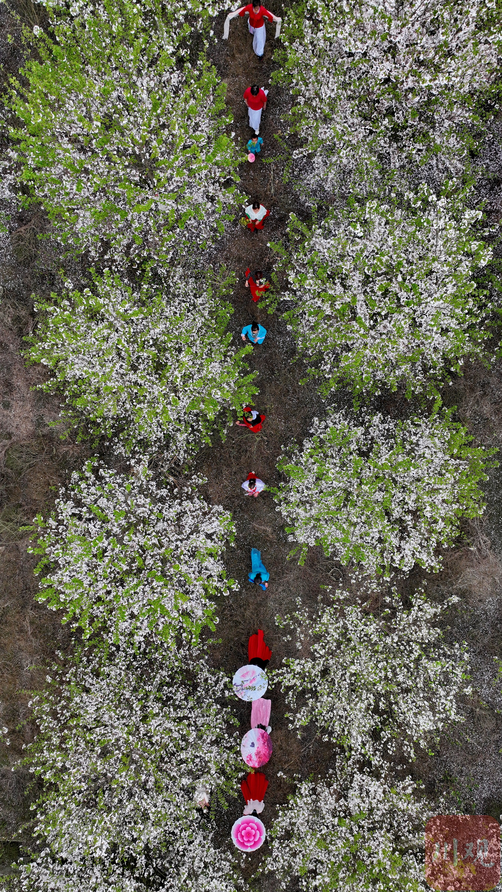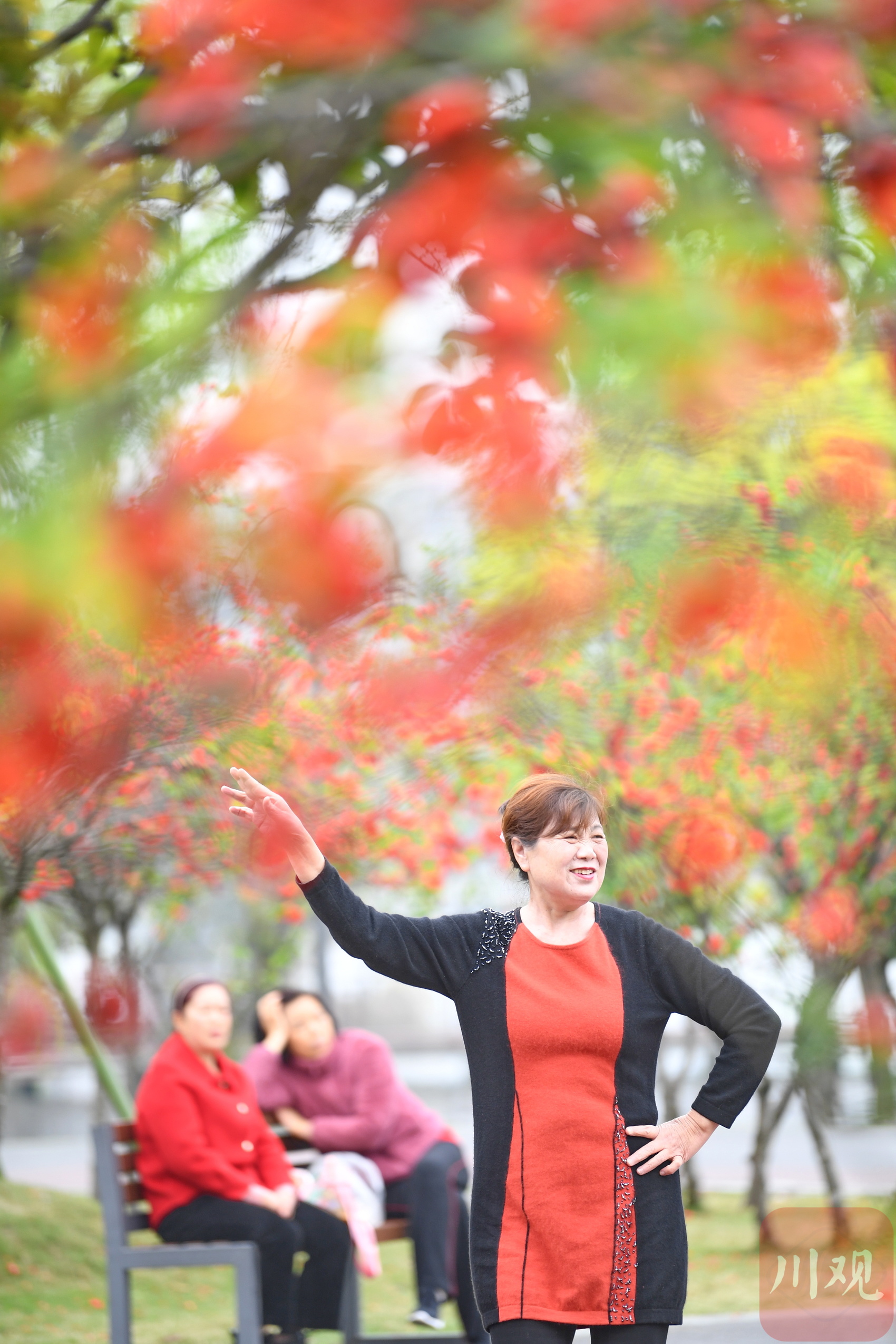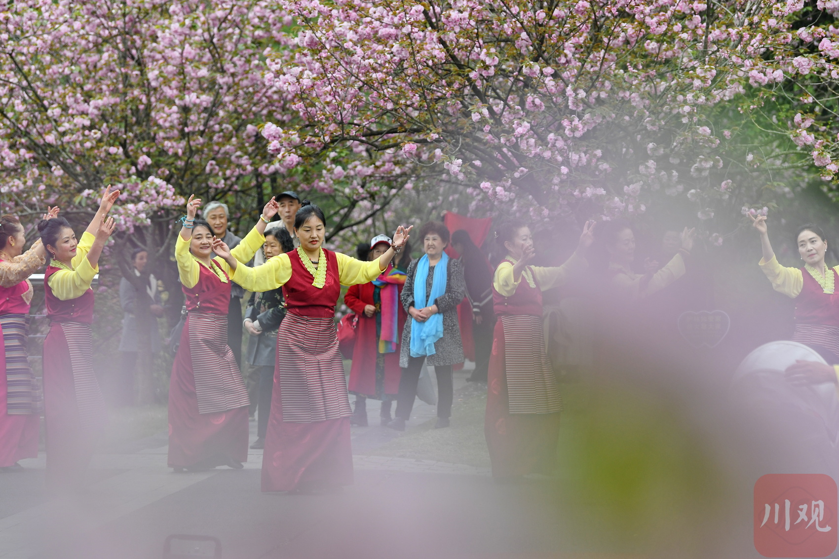 市民在成都一公园内的海棠花中跳舞。