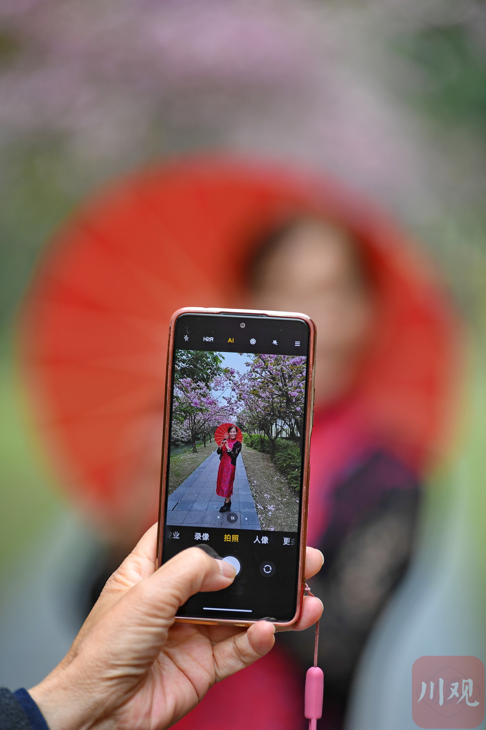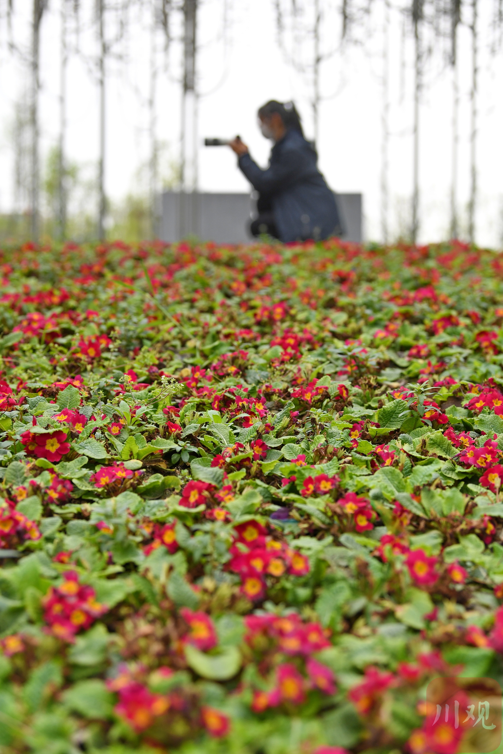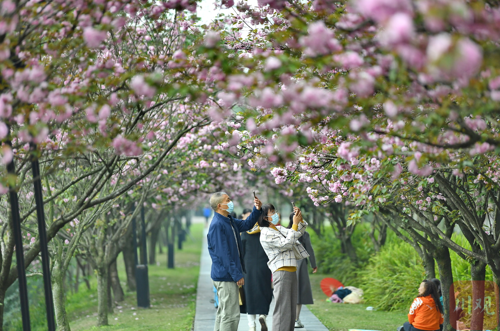 市民在成都一公园内赏花拍照打卡。