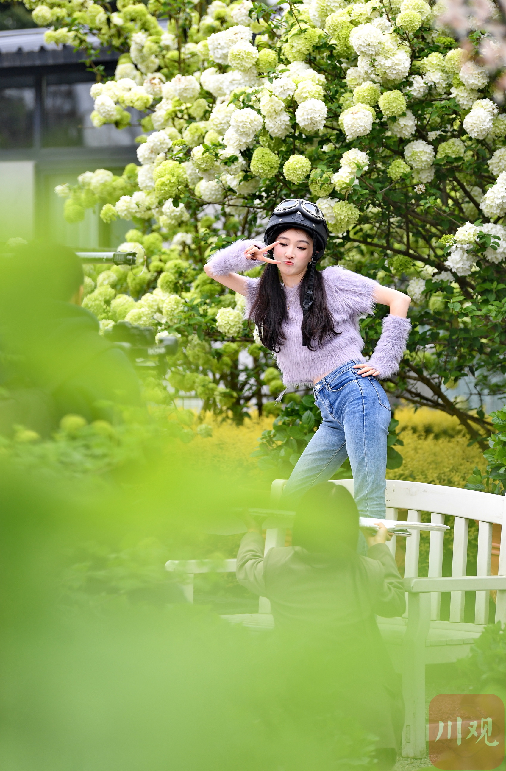 游客在成都一公园内的花海中跳舞。