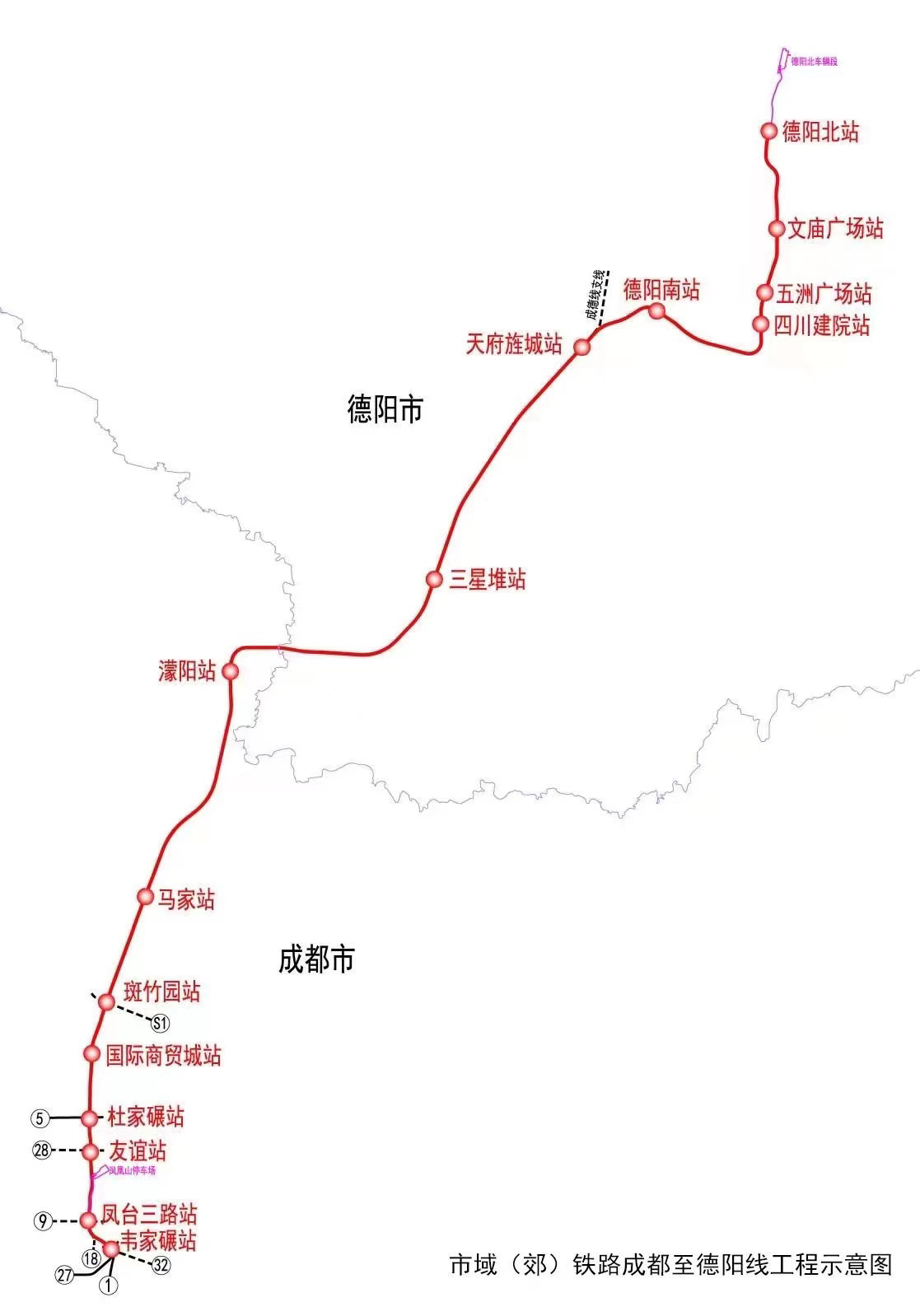 成都市住建局相关负责人介绍,市域(郊)铁路成都至德阳线全长70.869公里,起于成都轨道交通1号线韦家碾站,止于德阳市德阳北站,沿线串联成都市金牛区、新都区、彭州市、德阳市广汉市和旌阳区。全线共设置车站15座,其中地下站10座,高架站5座,总投资约305亿元。项目运行速度为160公里/小时,采用市域A型车4辆编组,建设工期49个月。其中,成都段线路长30.619km,设车站8座、停车场1座。