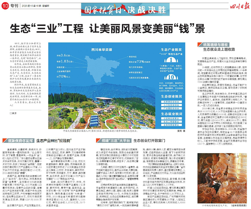 选准产业,越来越多的贫困群众吃上了“生态饭”。在大凉山,核桃是脱贫致富“金果果”,全州超过90%的贫困村都发展了核桃产业,48.6万贫困人口靠核桃脱贫;在秦巴山区的华蓥,油樟成为产业脱贫的引擎,贫困户参与土地流转和投工投劳,户均年增收突破两万元;在乌蒙山区的兴文,依托竹海资源发展生态旅游,贡献GDP约5000万元。