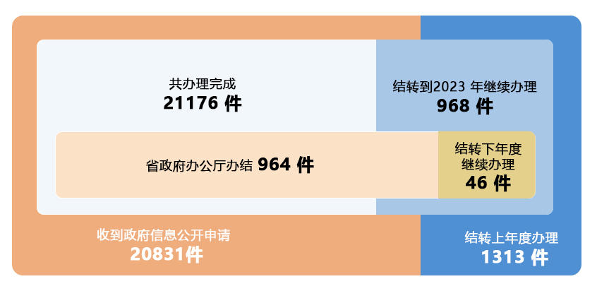 在依申请公开方面,2022年我省进一步规范登记、审核、办理、答复、归档等工作流程,提高依申请公开便民服务水平,全年收到政府信息公开申请20831件,结转上年度办理1313件,共办理完成21176件,结转到2023年继续办理968件。同时还依法办理涉及政府信息公开的行政复议901件、行政诉讼1068件。