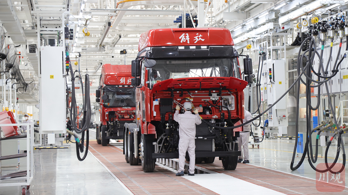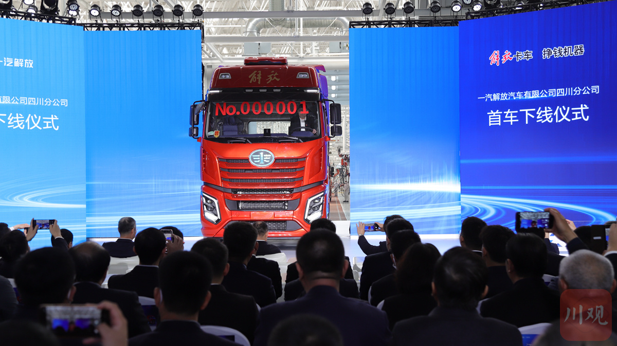 “嘀嘀!”3月30日上午,在德阳高新区一汽解放四川分公司的首车下线仪式现场,一辆型号为“解放J6V”的卡车缓缓驶出生产线。这台车的正式下线也标志着一汽解放商用车广汉基地正式建成投运,德阳将再增一个百亿“链主”。