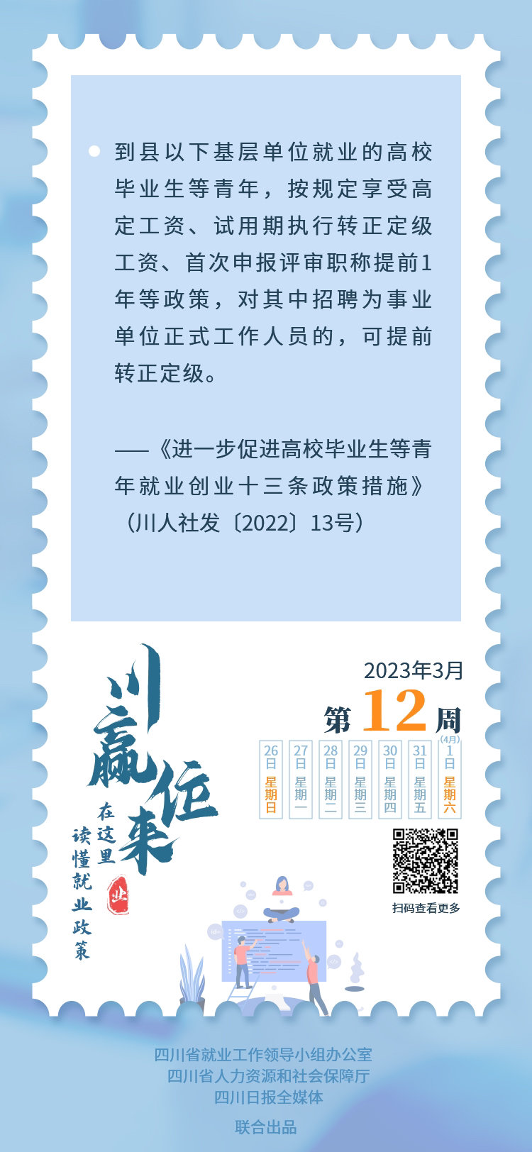 本周“川赢位来·就业政策周历”要向大家详细介绍的,就是“十三条措施”中有关“拓宽基层就业空间”的规定。这些规定包括: