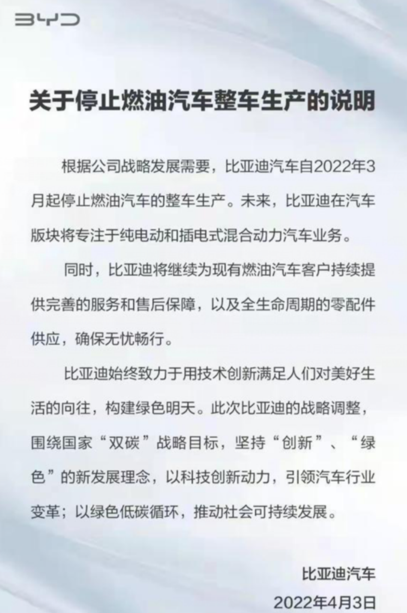 2022年4月,比亚迪官方宣布正式停产燃油汽车,未来将专注于纯电动和插电式混合动力汽车业务。此后,比亚迪汽车销量一路走高,在2022年度位列国内单品牌销量首位,也是全球新能源汽车年销量冠军。2022年比亚迪汽车销量186.85万辆,同比增长152.46%,其中新能源乘用车销量185.74万辆,同比增长212.82%,其中纯电动销量为91.11万辆,插电混动销量为94.62万辆。