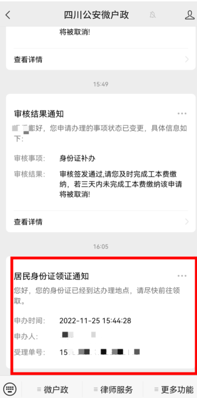制证完成后,会通过公众号推送通知信息,根据选择的领取方式,居民身份证将邮寄到家或者自行前往线下领取