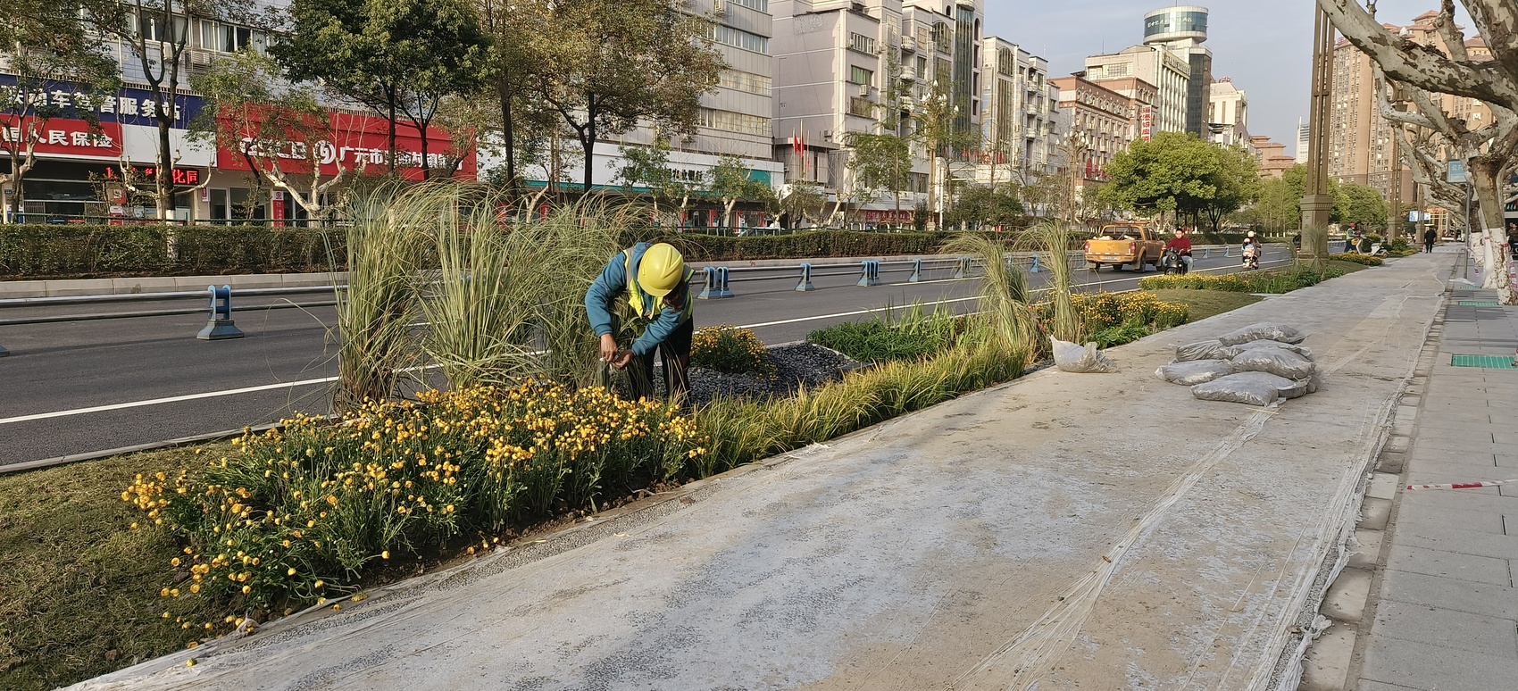 3月28日,广元市利州区利州东路二段的道路旁,工人按照海绵化建设的相关要求,进行景观提升改造——有的在放置透水砖,有的在雨水花园铺设鹅卵石。