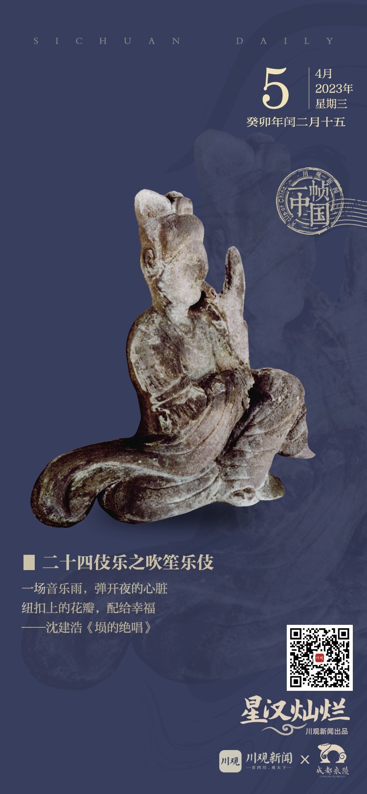 位于永陵棺床西侧中间位置的吹笙乐伎,其姿态侧身向南,双手捧持笙斗,头微仰,口衔斗嘴、鼓腮吹奏,情态生动。“笙”是中国古代传统的多簧多管乐器,商代甲骨文中已有记载,《诗·小雅·鹿鸣》中也留下了“我有嘉宾,鼓瑟吹笙”的佳句。到了唐代,笙成为主要流行乐器之一,因簧片易受潮,吹奏时需先在火上炙烤,待簧鼓,然后吹奏。声音轻柔美妙的笙,在唐宋时期传入日本及东南亚、南亚地区,成为国际化程度颇高的中国传统乐器。笙由笙斗、簧片、笙脚、笙苗、按音孔等组成。笙斗原以开有按孔的匏(葫芦)制作,唐代改用木制,上插多管带簧片的竹管,加上斗嘴(吹口)而成,按形体分大匏笙、小匏笙。因笙的外形竹管参差不齐似凤鸟翅翼,故有“凤笙”“凤翅”“凤翼”之名。