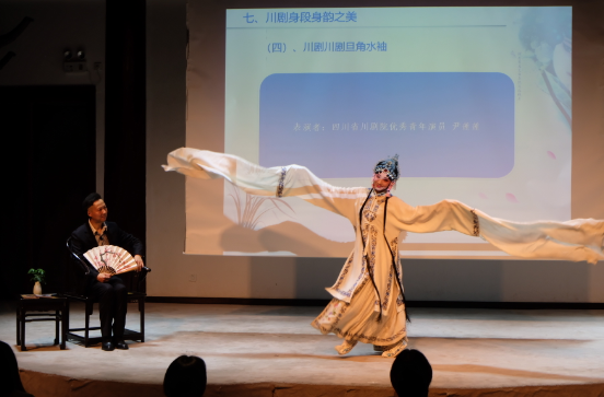 四川省川剧院的优秀青年演员王子豪、尹莲莲现场用川剧变脸、水袖、展示小生“扇子功”技法、川剧音乐唱腔之美。水袖拂、搭、裹、抛、托、抓、抖、挽、转、扬,有喜时挽花舞袖,怒时耸肩抓袖,哀时抽泣垂袖,乐时跳跃抛袖,随着人物的情绪变幻莫测,舞韵的巧拙也千差万别。