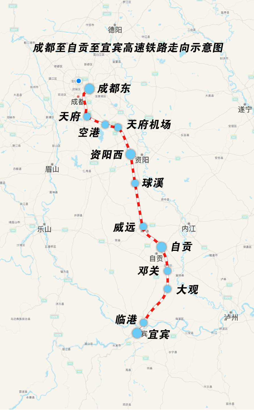 成自宜高铁是国家“八纵八横”高速铁路网中“京昆通道”的重要组成部分,全线建成通车后,从成都到自贡仅需40分钟左右,到宜宾仅1小时左右,实现成都核心城区与天府国际机场、成都都市圈与川南城市群的快速连接。成自宜高铁在宜宾与渝昆高铁、成贵高铁相接,形成成都至昆明、贵阳、广州的高速铁路大通道,对完善区域路网结构,打通成都直达云南桥头堡及珠三角重要经济区最快捷高铁大通道具有重要意义。