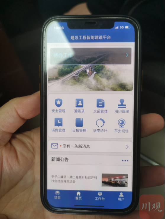 孙周辉拿出手机,点击进入一款名为“建设工程智能建造平台”的APP。项目管理、进度管理、安全管理、质量管理等下拉菜单一目了然。