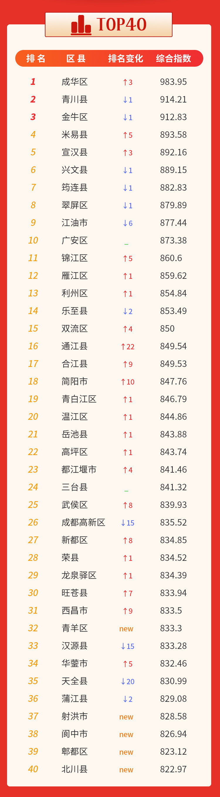 本期指数前40名中,成都市成华区名列第一,广元市青川县、成都市金牛区、攀枝花市米易县、达州市宣汉县入围前五名。