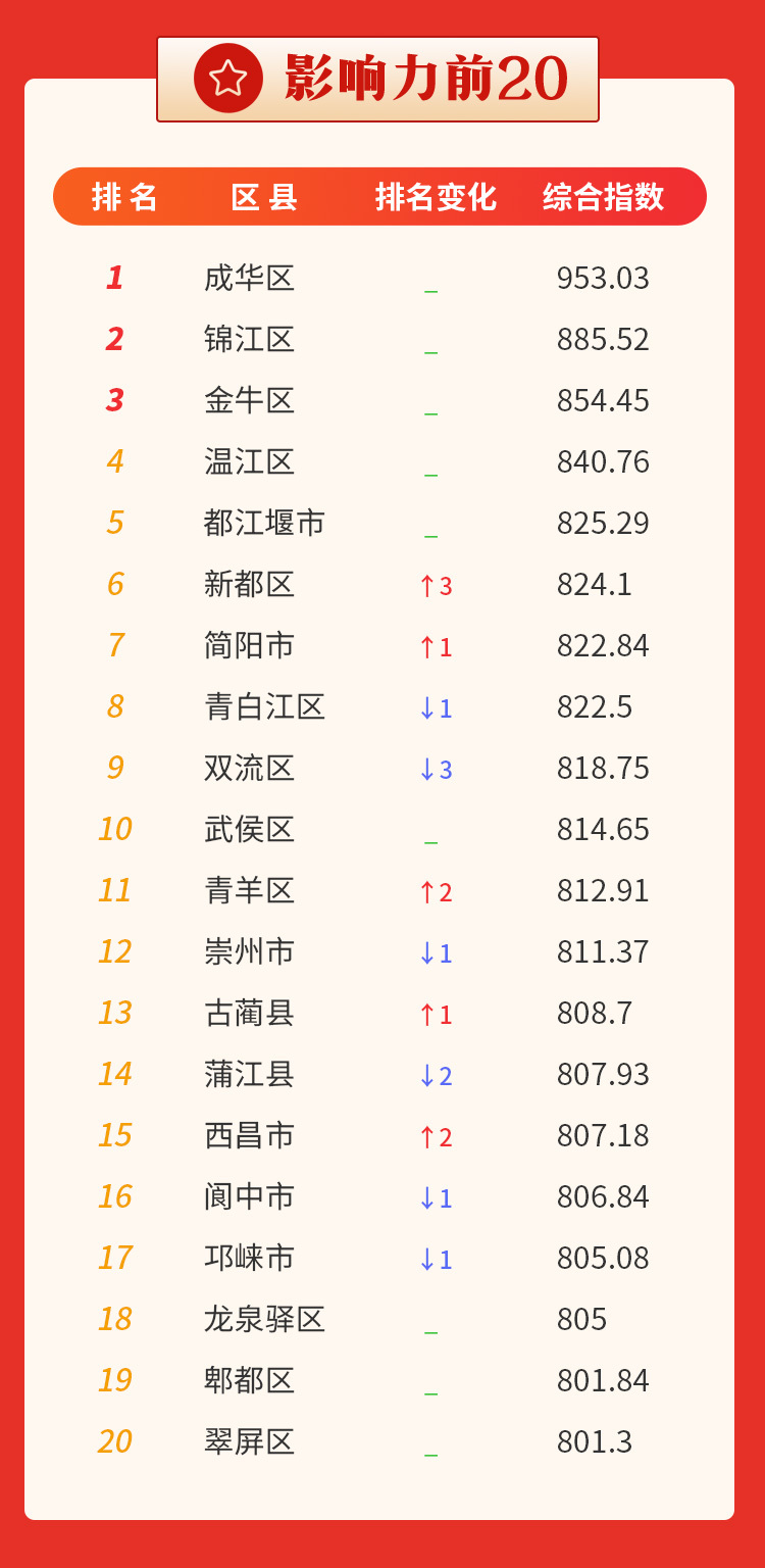 从影响力前20名统计结果看,排名变动较小,无新入围县(市、区),前五名均与上月一致。成都市成华区蝉联第一,成都市新都区上升幅度最大。