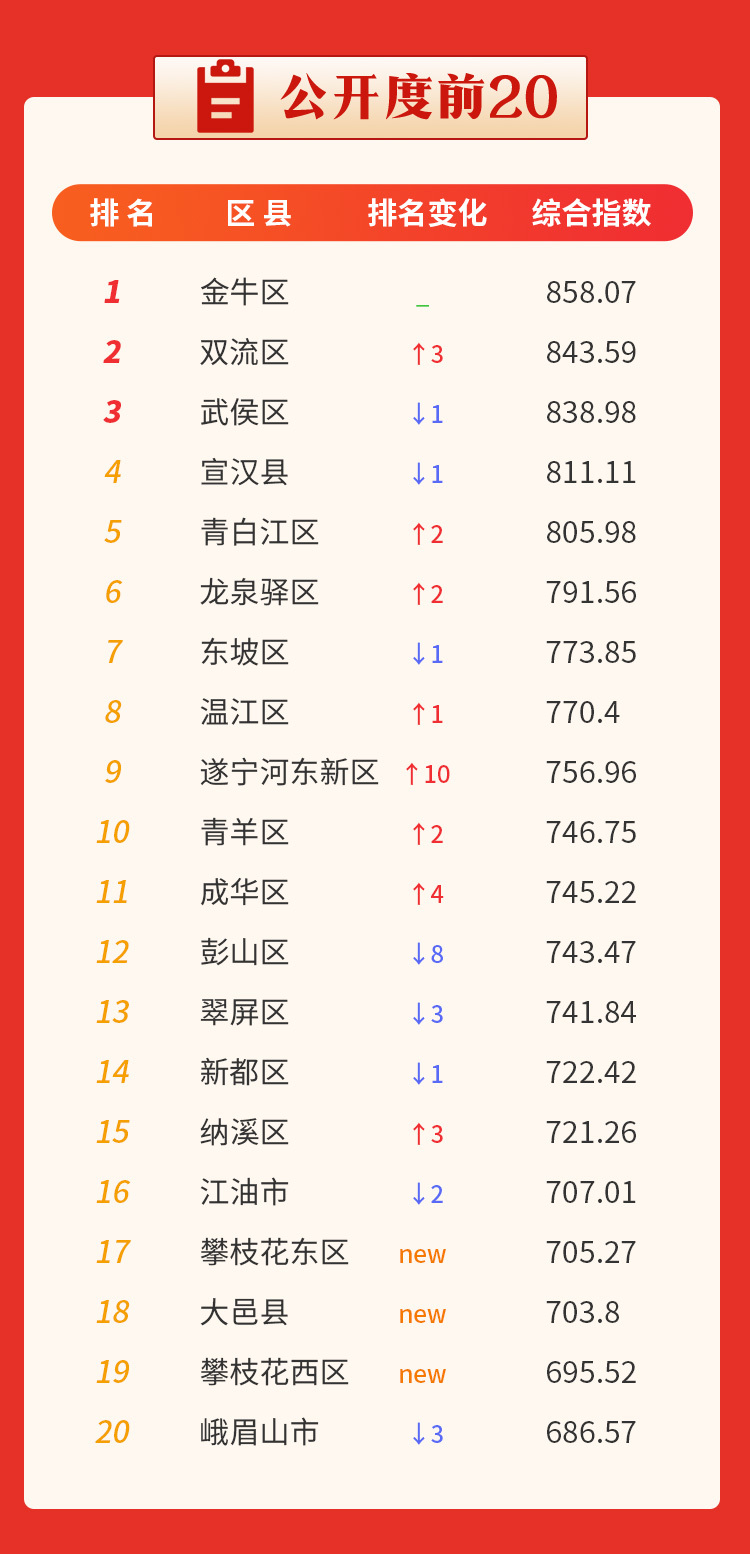 从公开度前20名统计结果看,成都市金牛区蝉联第一,成都市双流区、武侯区,达州市宣汉县,成都市青白江区名列前五。遂宁河东新区排名上升最多,从上期第19名升至第9名。攀枝花东区、成都大邑县、攀枝花西区是新入围县(市、区)。