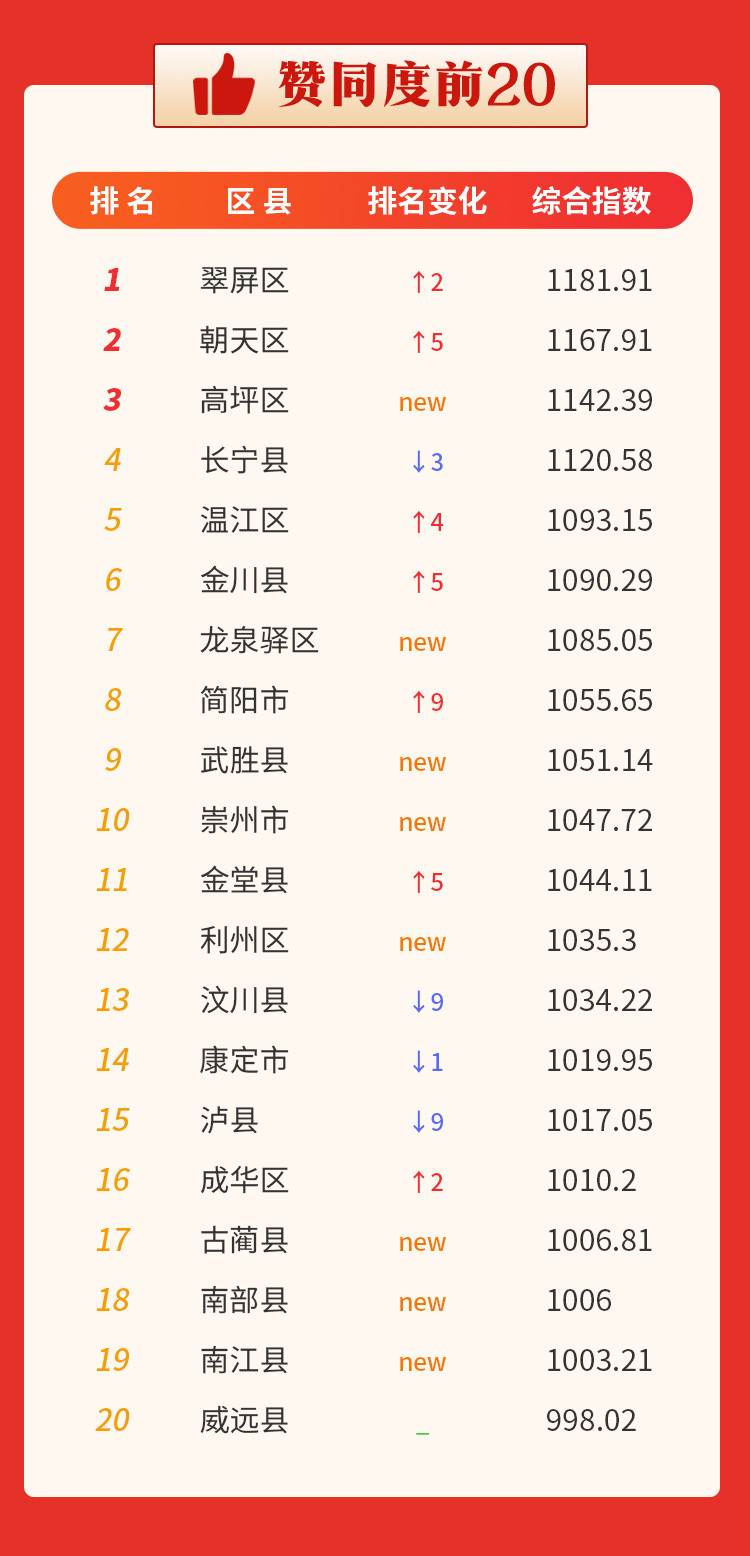 从赞同度前20名统计结果看,宜宾市翠屏区名列第一,其次为广元市朝天区、南充市高坪区、宜宾市长宁县、成都市温江区。新入围县(市、区)8个(占比40%),其中南充市高坪区排名最高(第3名)。成都简阳市排名上升最多。