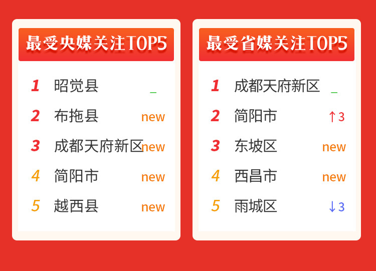 在央媒关注榜中,凉山州昭觉县、布拖县,成都天府新区,成都简阳市、凉山州越西县名列最受央媒关注前5名,3个县来自凉山州,反映出央媒对大凉山脱贫攻坚进展关注密切。