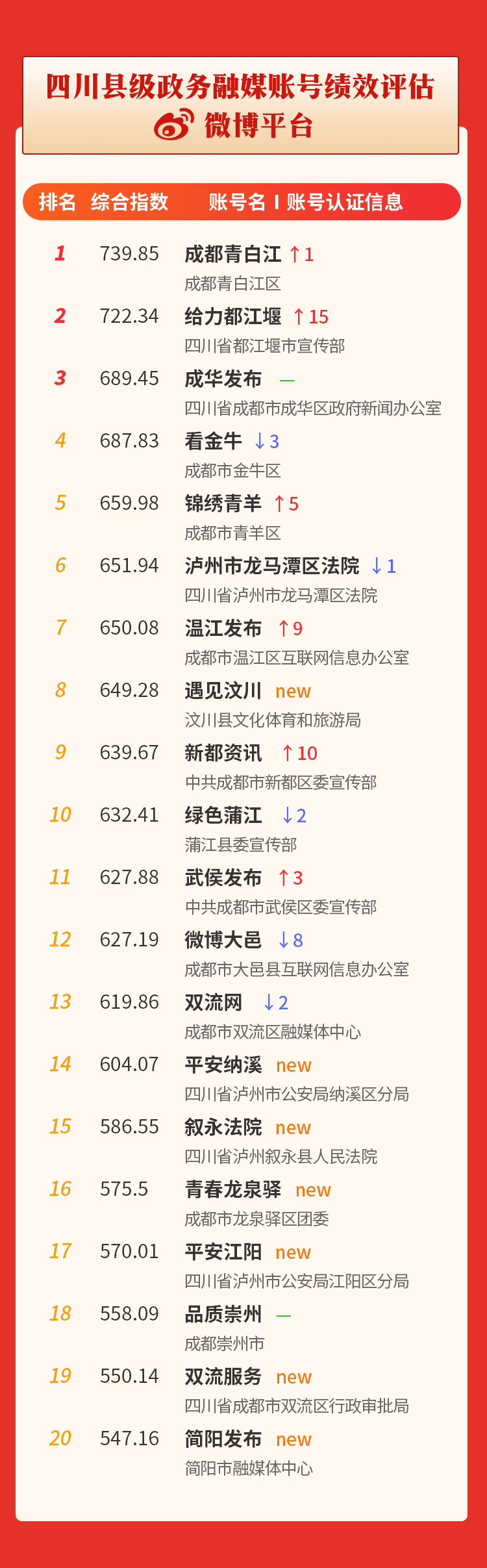 在本期指数统计到的11442个微博账号中,月累计点赞量前五名账号依次是:成都青白江、成华发布、叙永法院、给力都江堰、双流网;月累计转发量前五名账号依次是:给力都江堰、成都青白江、青白江嘿好吃、看金牛、新都资讯;月累计评论量前五名账号依次是:成都青白江、看金牛、成华发布、锦绣青羊、稻城亚丁小田哥。