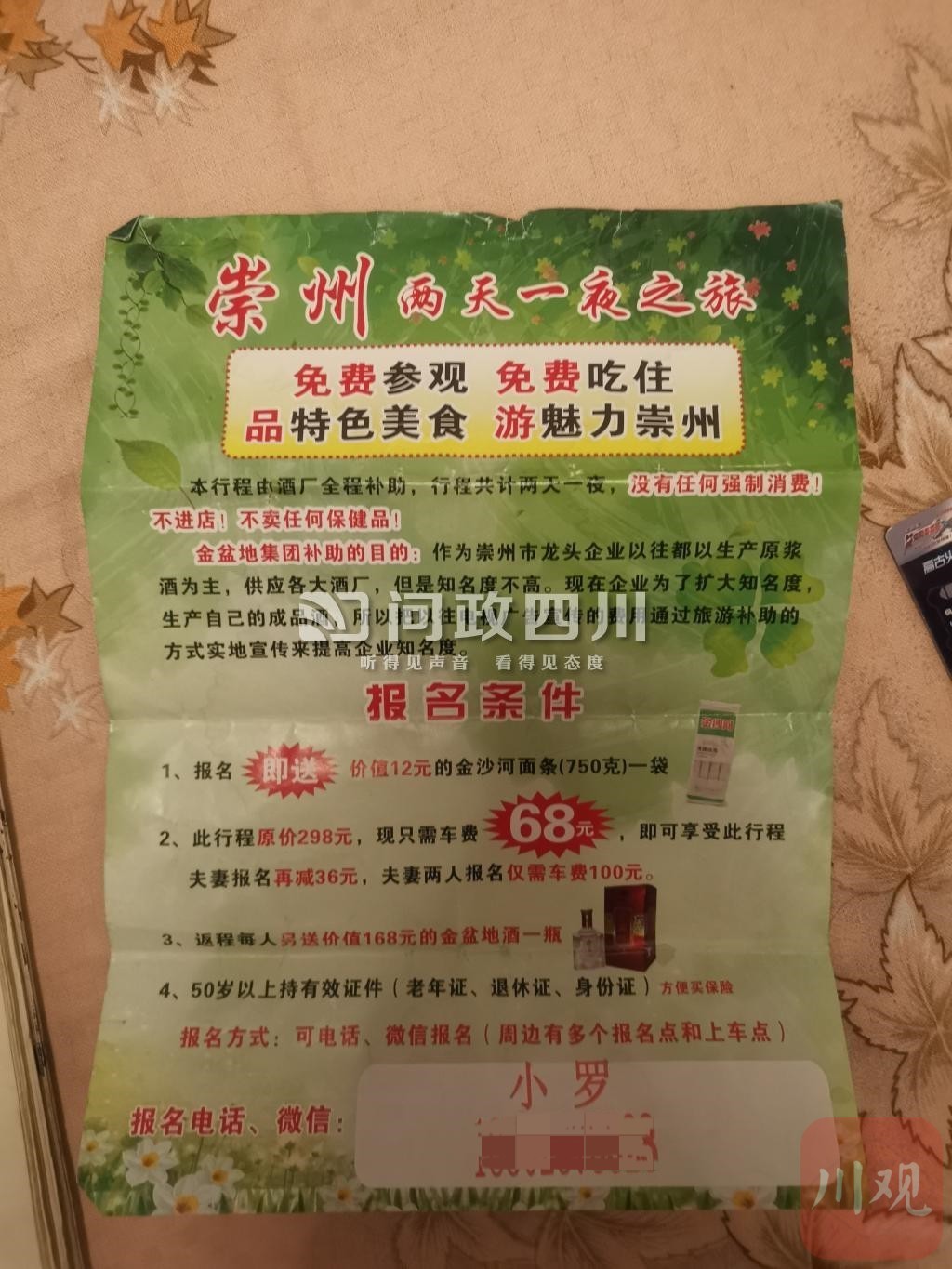 据了解,老人们一开始都是参加了路边旅游团或小区物业公司组织的成都周边低价旅行团。记者在一张旅行团宣传单上看到,报名条件专门写有“50岁以上持有效证件……”