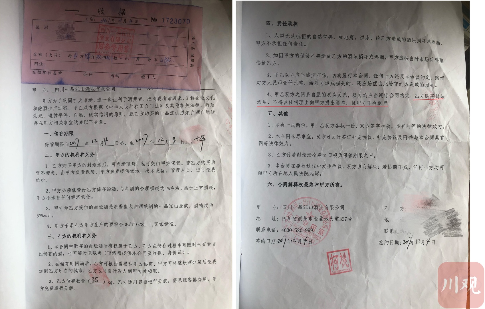 老人们购买酒后,并不会将酒拿回家,而是把酒继续存放在博览园,老人们会和销售公司签署一份“自愿购酒储存合同”,协议约定由酒业公司为其提供所购坛装酒的存储、看护以及按需分装等后续服务。按照销售公司工作人员的说法,这样的保存方式可以让酒质不断提升,而酒的价值也就随着酒质的提升而水涨船高了,这也就是所谓的“种酒”。