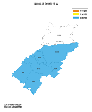 强降温伴随降雨而来。达州市气象台2日下午同时发布强降温蓝色预警:预计3日至5日,达州全市大部地方日平均气温将累积下降7~9℃,万源6~8℃,冷空气影响时伴有3级至5级偏北风,山口河谷地区可达6级及以上。达州市气象台提醒,请注意防范强降温、雨、大风天气给生活生产带来的不利影响。