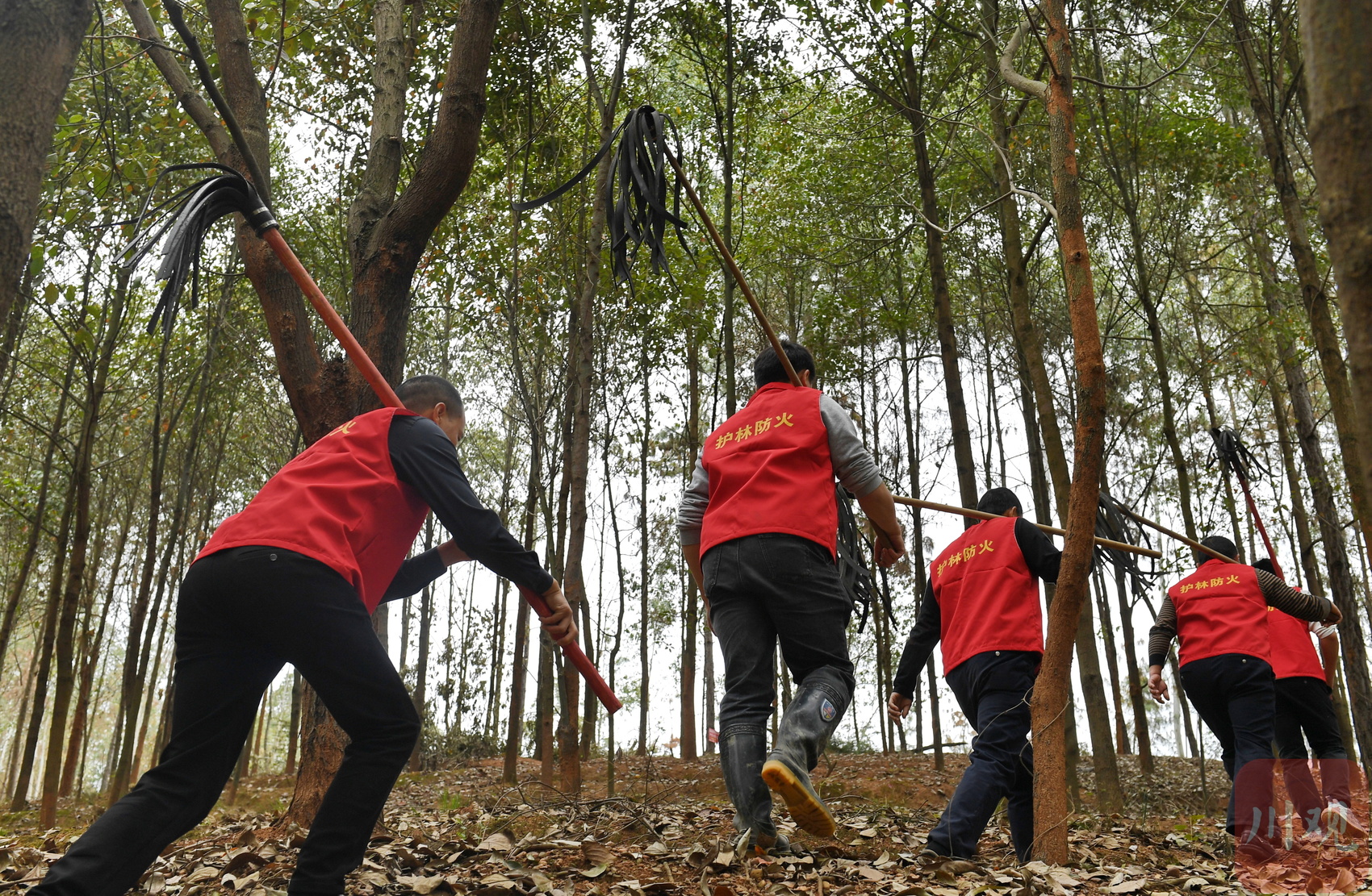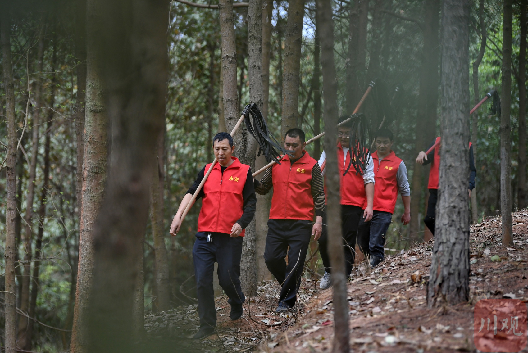 在成都市双流区永安镇梨园村高楼山上,当地义务扑火队员忙碌的在山林里开展防火安全巡逻。