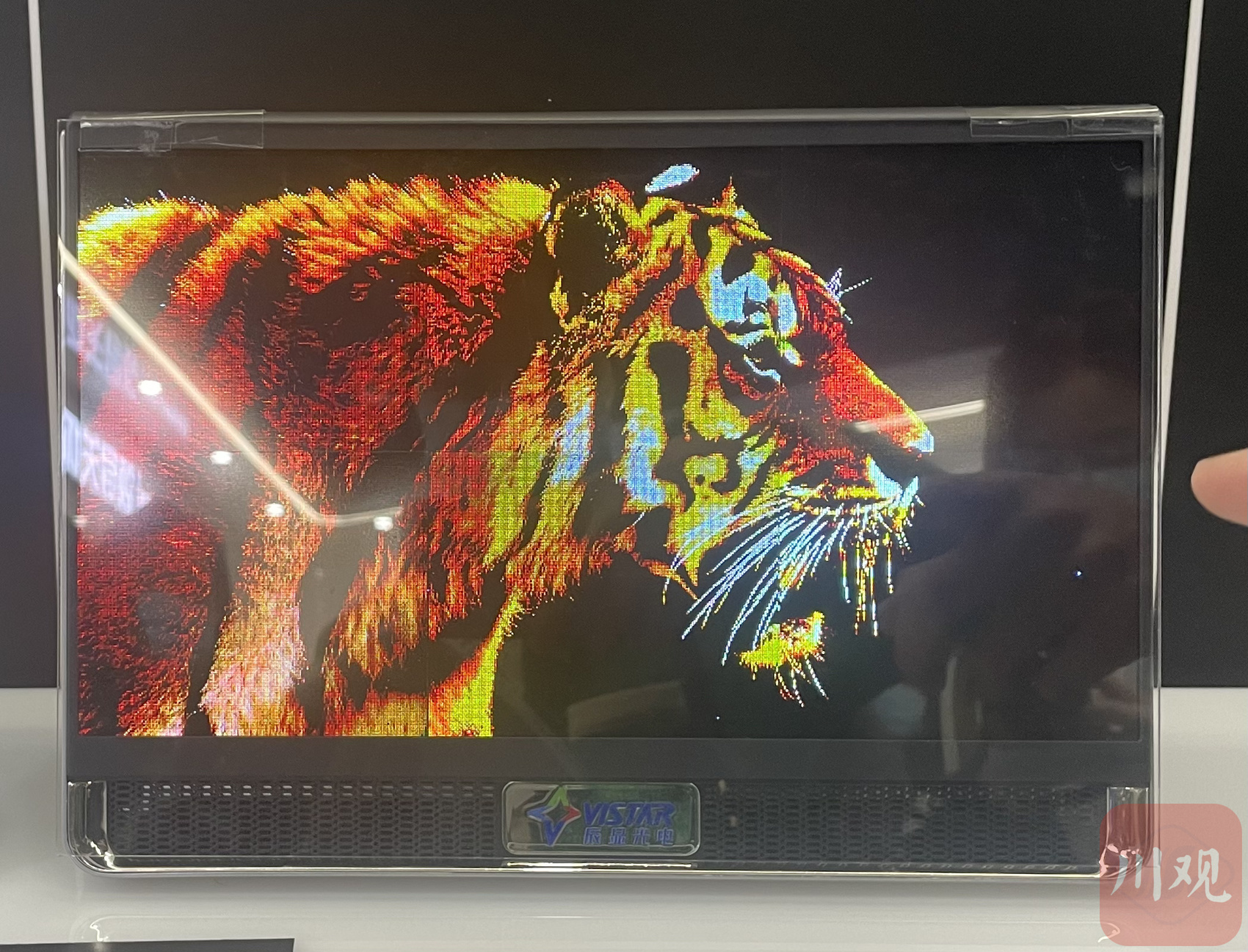 在辰显光电生产的屏幕样品中,川观新闻记者见到了巨量转移关键技术突破的成果。六块单屏无缝拼接出的12.7英寸屏幕,一只毛茸茸的老虎头赫然在目,“这是全球首次采用25微米的芯片来做的。”付超凡介绍,小小的屏幕上面均匀地分布了52万颗LED芯片,每块芯片的大小约等于头发丝横截面的一半。据了解,辰显光电产品巨量转移良率已达到99.99%。