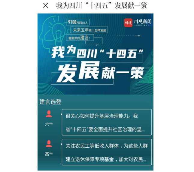 川观新闻作为官方授权的网络参与渠道之一,今年9月7日以来,征集了千余条网友意见建议(相关报道>>快来,为四川“十四五”发展献一策!网上意见征求活动即日起开始)。