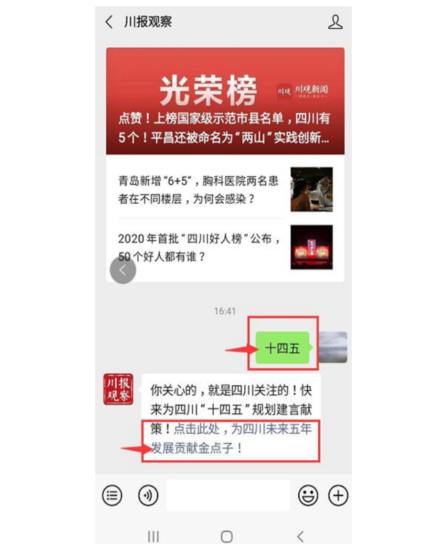 关注“川报观察”微信公众号,给公众号发送留言关键词“十四五”,系统自动弹出“点击此处,为四川未来五年发展贡献金点子!”,点击文字链接,即可直达建言页面,提交金点子。