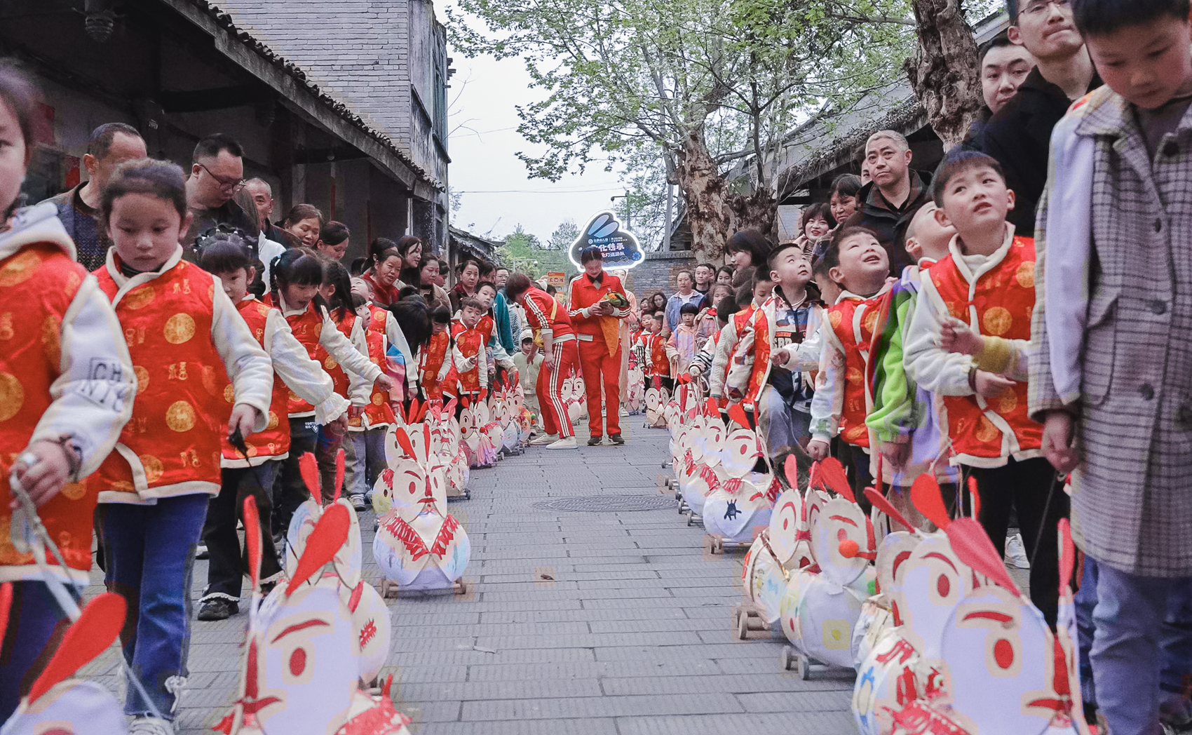 还有不少游客是为了元通古镇世代相传的另一项民俗文化活动,“拉兔灯”而来。当天傍晚,一支由元通镇幼儿园小朋友组成的队伍,拉着兔灯从幼儿园出发,一路秩序井然到达惜字宫,将兔灯摆放成可爱的“熊猫”形状,围着“熊猫”表演起了欢快喜庆的舞蹈,现场气氛热烈。