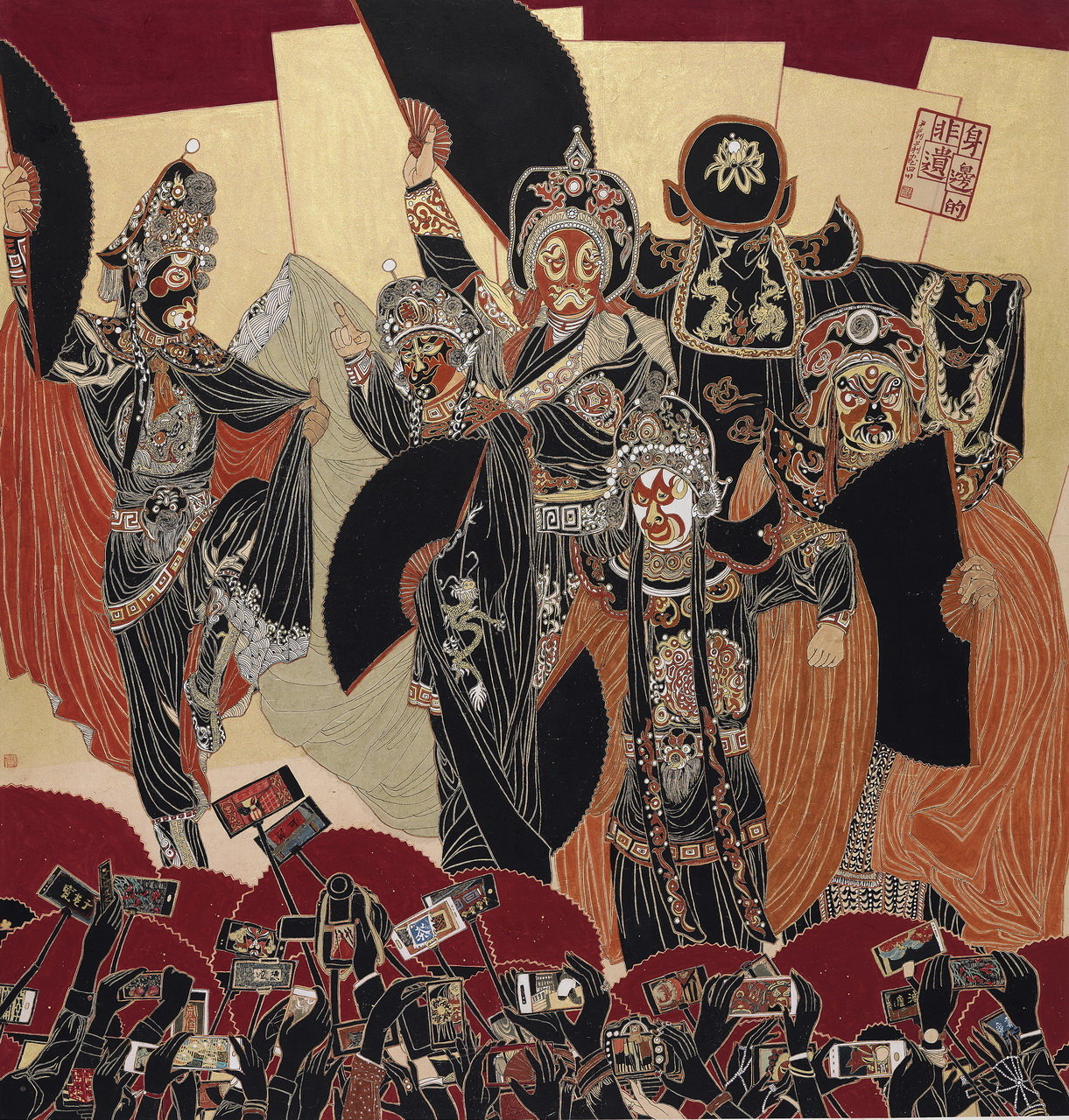 《身边的非遗》曾入选第十三届全国美展,作品源于极具巴蜀文化特色的非物质文化遗产川剧之绝活变脸。变脸艺术深得四川当地居民和外地游客喜爱,在本地茶馆、餐厅和文旅地标常见其表演,是一张富有魅力的四川特色文化名片。《身边的非遗》用线描结合重彩的绘画语言表现了变脸艺术的瞬间,画面运用了构成设计的手法,很好地结合了台上传统戏剧与台下现代生活。观众手机里的画面呈现了更多特色文化元素,表现了四川市民生活的多姿多彩。作品具有浓厚的地域特色,让更多人认识成都、认识四川,了解巴蜀文化艺术之美。