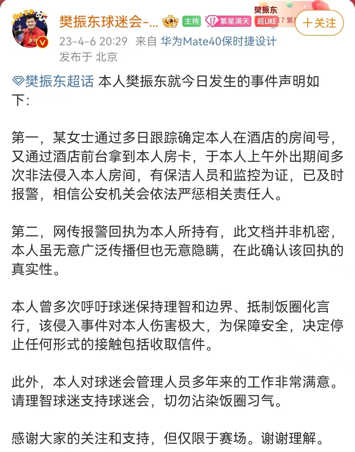 “请理智球迷支持球迷会,切勿沾染饭圈习气。”昨晚,中国乒乓球运动员樊振东在社交媒体发表声明称,某女士通过多日跟踪确定其在酒店的房间号,又通过酒店前台拿到房卡并多次非法侵入房间,有保洁人员和监控为证,目前已经报警。