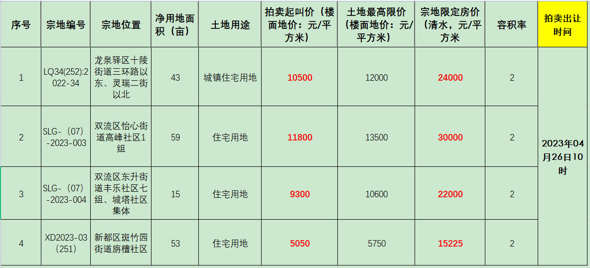 4月6日下午,成都市公共资源交易服务中心发布了中心城区新批次涉宅用地拍卖公告,来自龙泉驿区、双流区和新都区的4宗纯住宅用地将于4月26日上午10点开拍,合计面积约170亩,拍卖方式依然是“限房价、定品质、竞地价”。