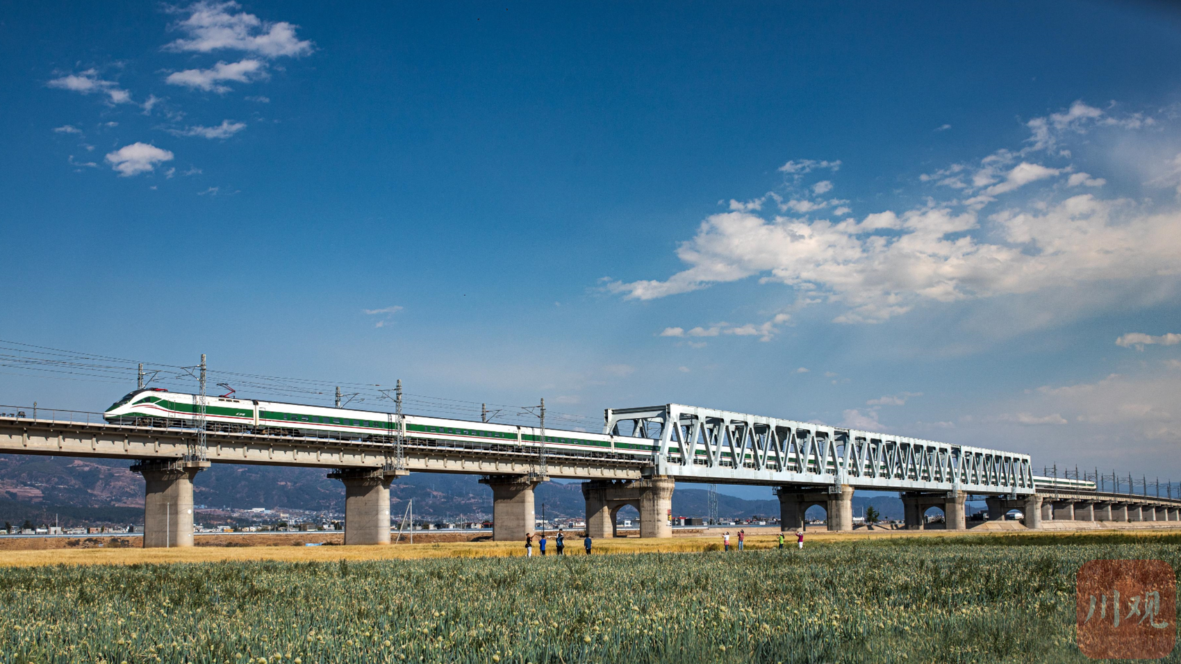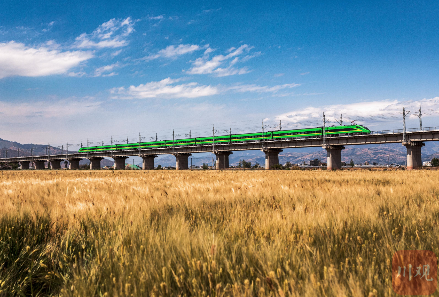 4月6日,微风吹过凉山州西昌市樟木箐镇字库村的连片麦田,碧空下金色麦浪随风起伏。由于独特的气候,这里的小麦已经进入成熟期。不远处,新成昆铁路上的“绿巨人”动车组飞驰而过。动车与麦田交相辉映,形成了一道靓丽的风景线。