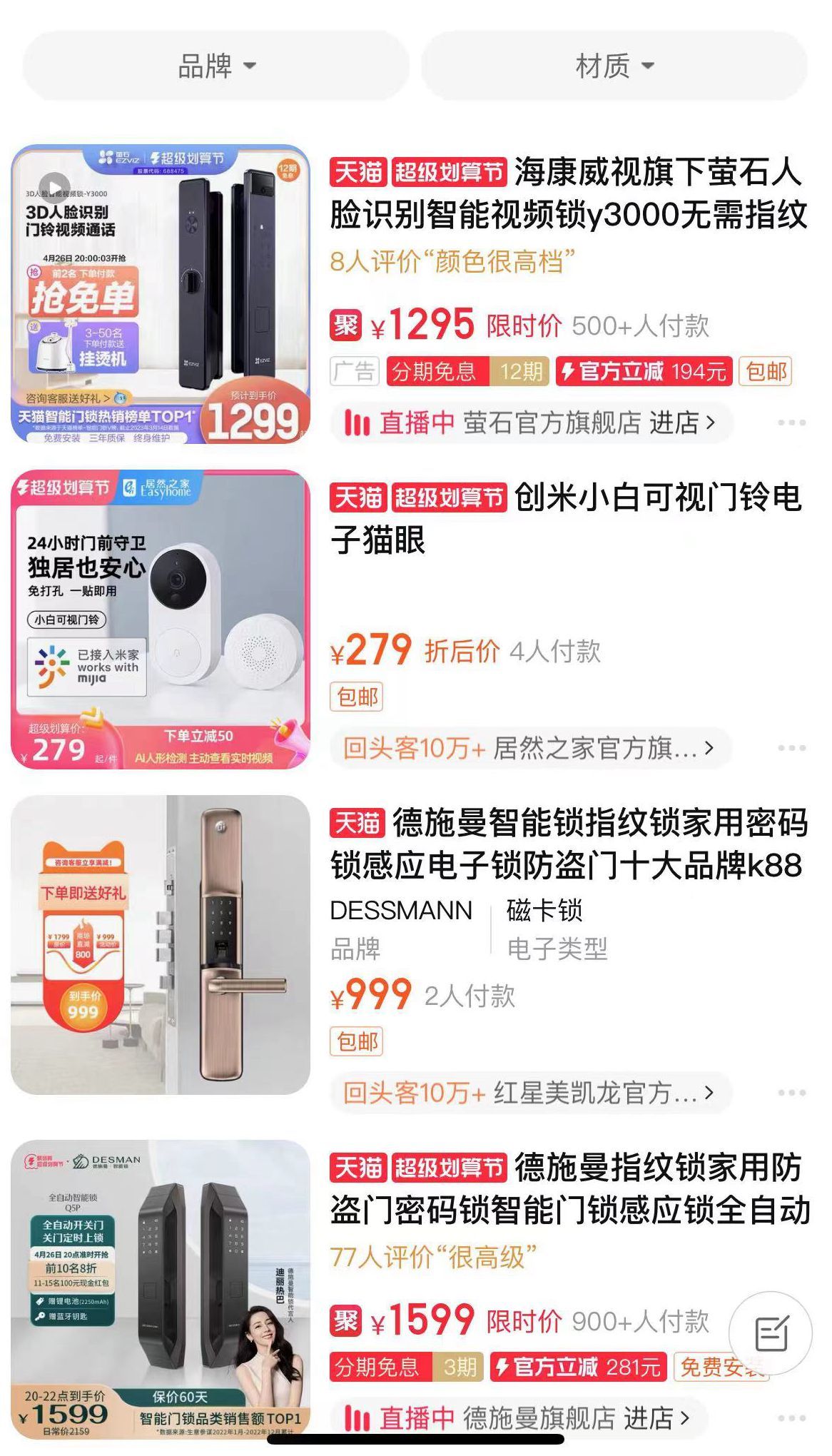 根据雷女士的反映,记者到各电商平台上搜索发现,类似的智能门铃门锁非常普遍,价格低则几百元,高则达数千元,很多智能门铃门锁的销售数据都超过1000件。