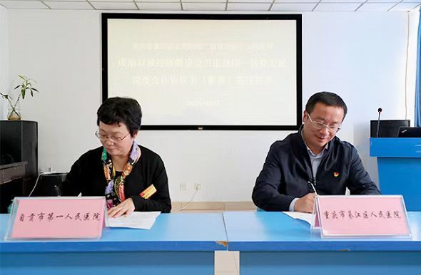 重庆市綦江区人民医院党委书记王江与自贡市第一人民医院党委书记姜晓燕签订《成渝地区双城经济圈建设重庆市綦江区人民医院·自贡市第一人民医院卫生健康一体化发展深度合作协议书》,进一步助推两院在医院管理、学科建设、科研项目申报、医疗卫生服务及远程医疗网络等方面协同发展。