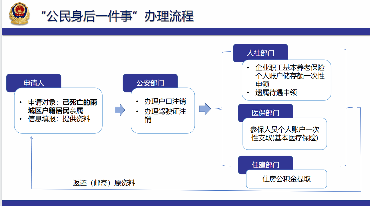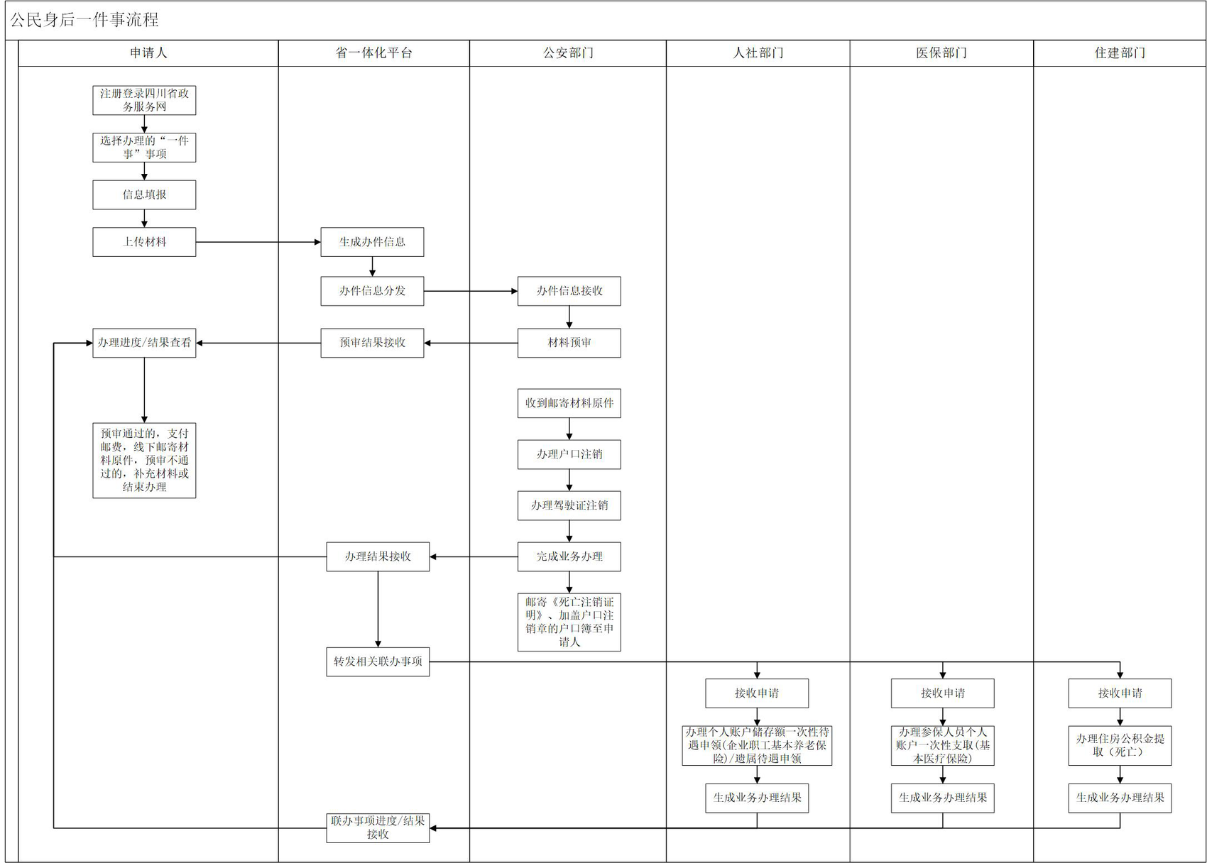 记者了解到,“公民身后一件事”是为已故的川内户籍居民办理户口注销、社保、公积金账户支取等业务的服务。公民身后事的原有办理流程繁琐,群众需要在公安、民政、社保、卫健等多部门来回奔波。“伤心事难以宽心办”成为了群众急、难、愁、盼的烦心事。