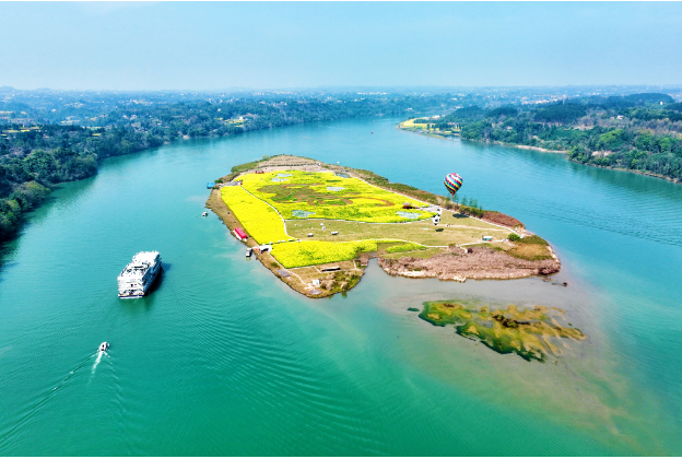近日,以“嘉陵江畔游 两岸菜花香”为主题的广安市武胜县首届大地油彩三乡村文化旅游节开幕。图为航拍武胜县中心镇应龙岛。夏俊林 摄