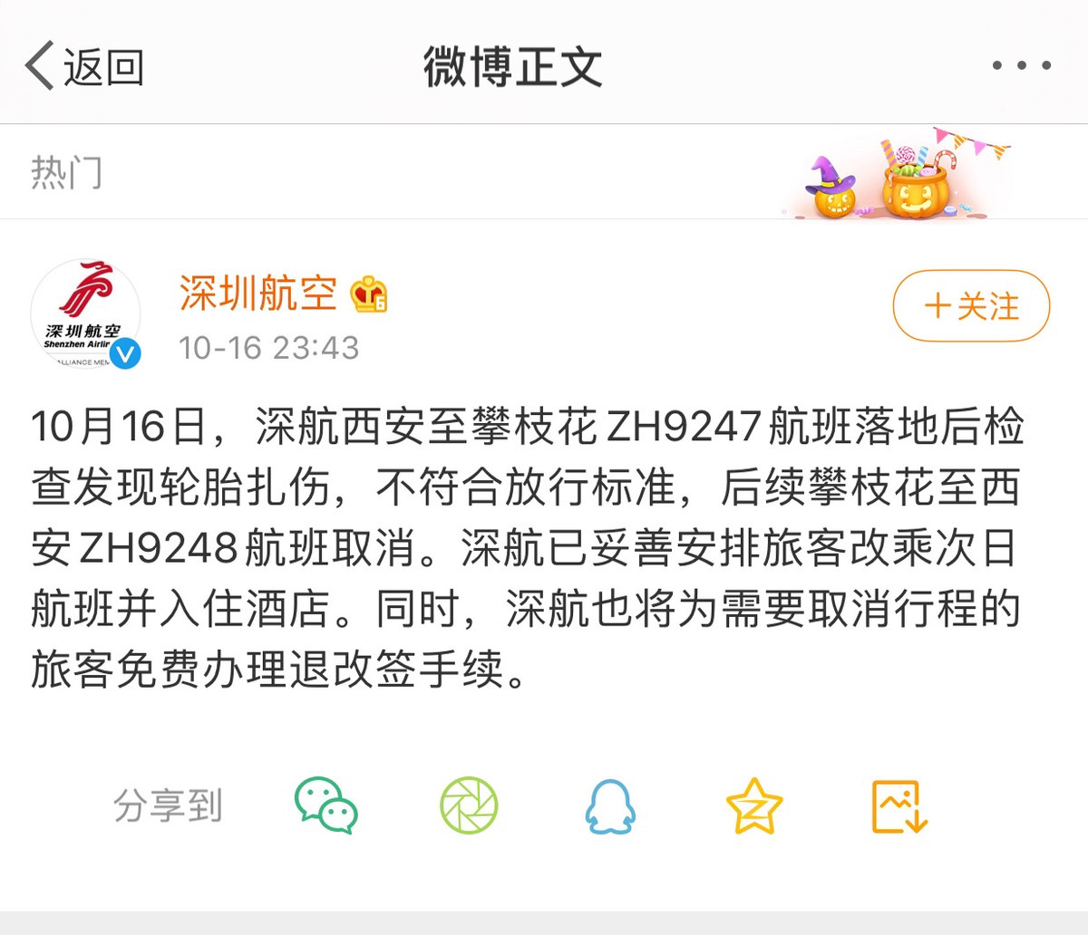 10月16日晚23时43分,深圳航空官博发布消息称深航西安至攀枝花ZH9247航班落地后检查发现轮胎扎伤,后续航班取消。